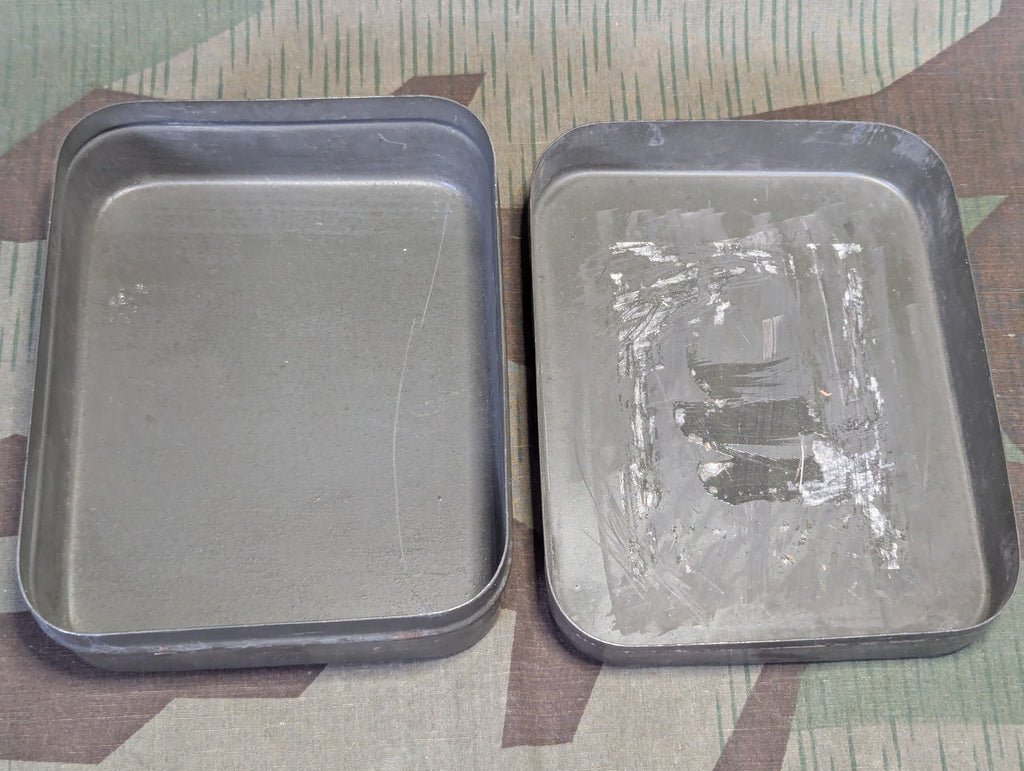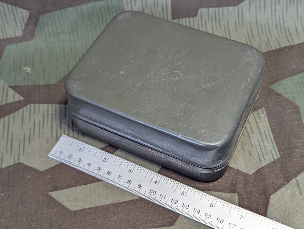 Original large tin for mine fuses. The paint is quite nice; the tin isn't too beat up. There is some residue where the labels were removed. Nice big tin.