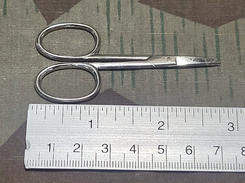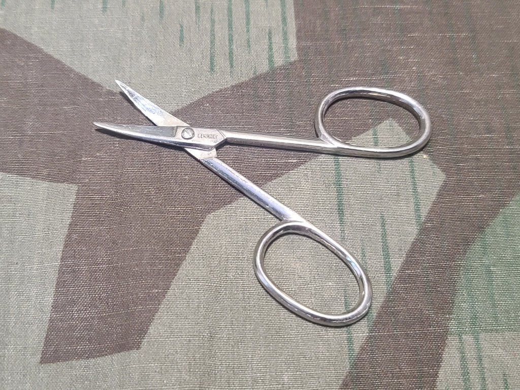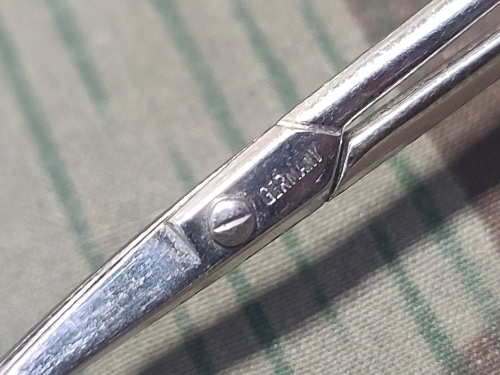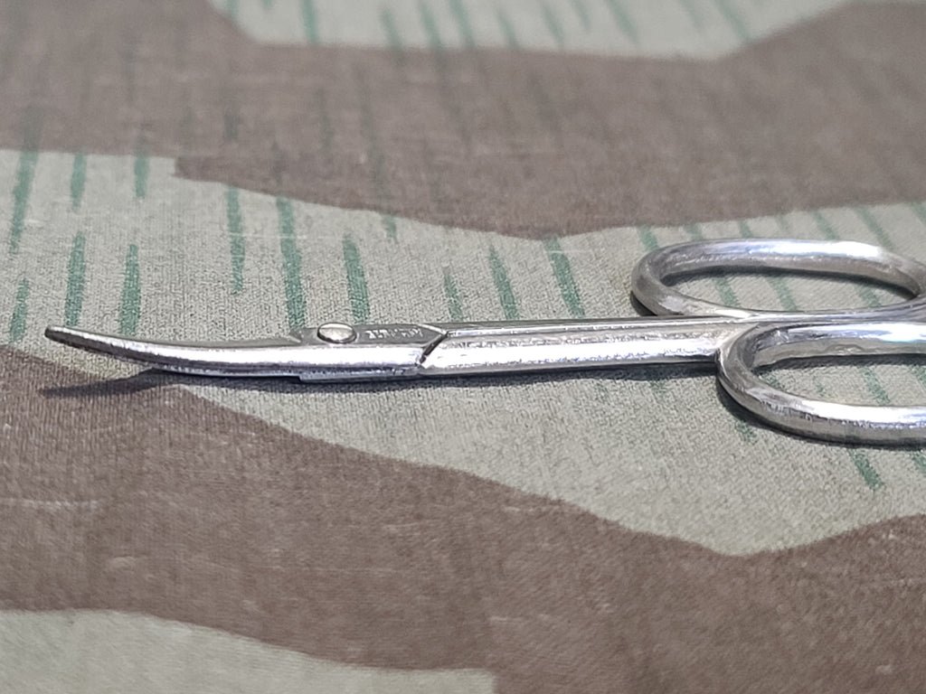 Good solid small German curved hygiene scissors. They cut decently well. Marked Germany,