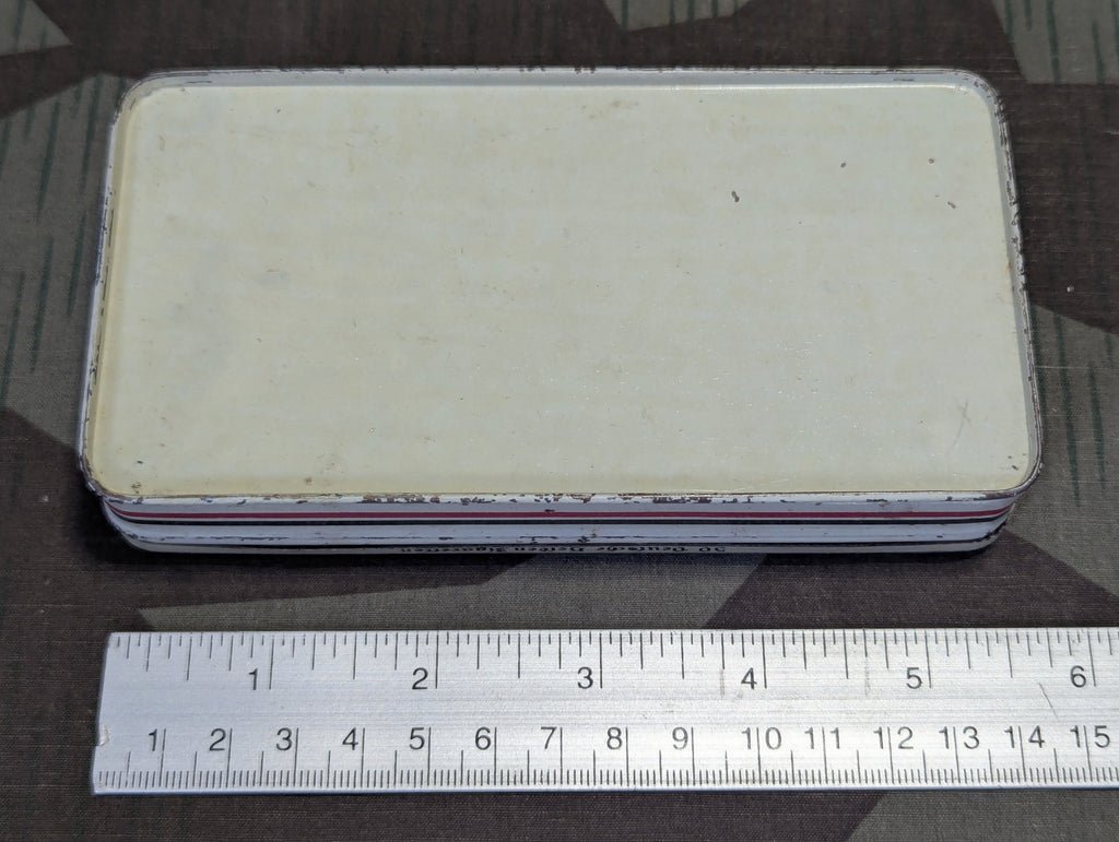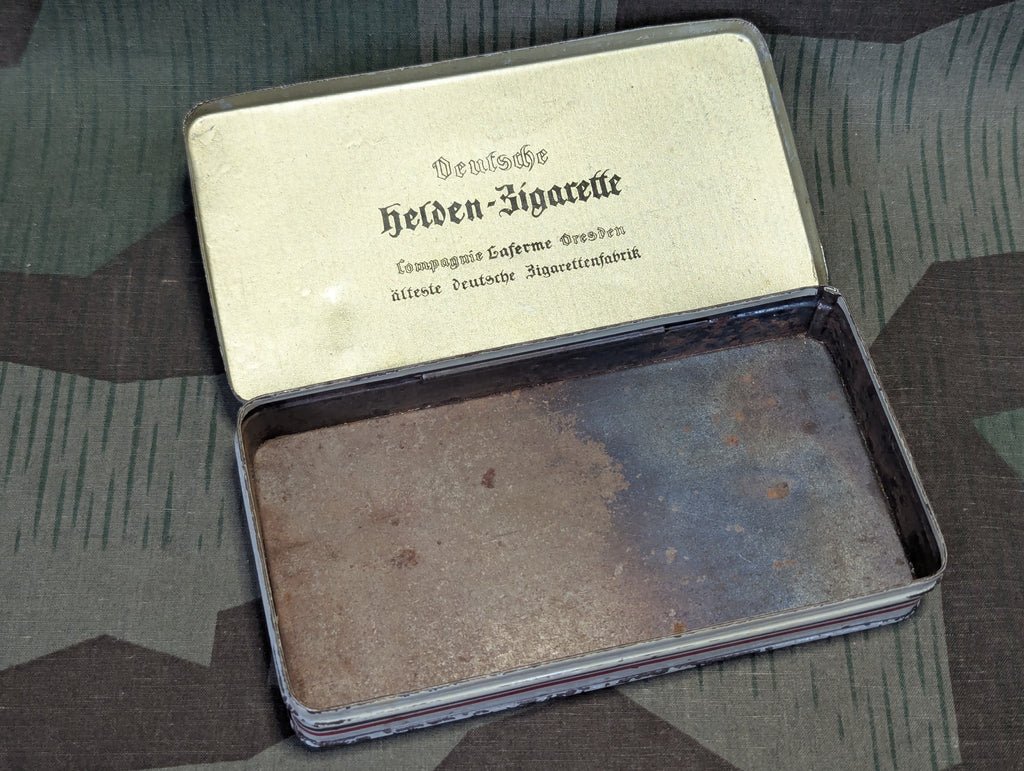 Original Deutsche Helden Zigarette cigarette tin. It is in ok condition with some wear, fading, and some light rust inside. If I had to guess I would say this was WWI, and based on what little information I can find, that seems to be accurate. One source dated the tin to 1914 somehow and others range from 1900-1930. The general style of it is very fitting for WWI graphics.