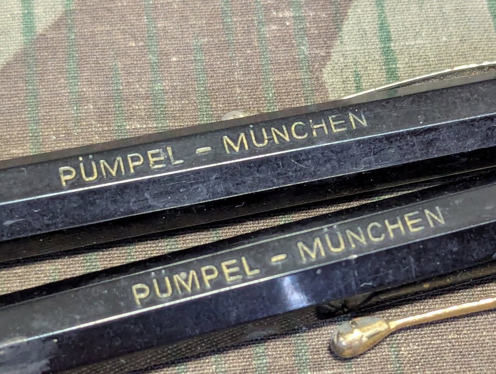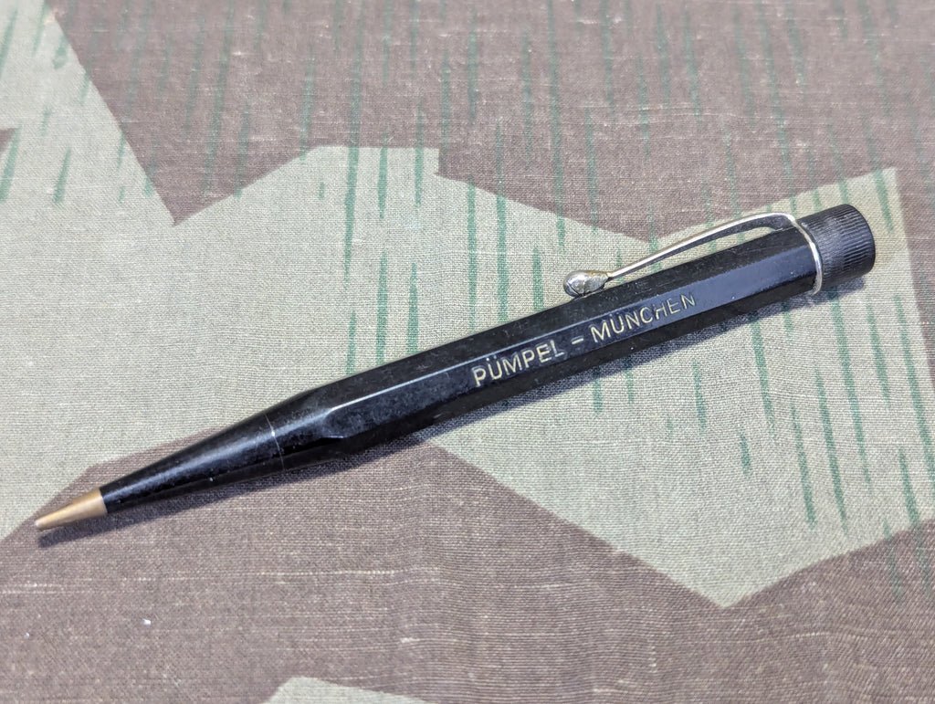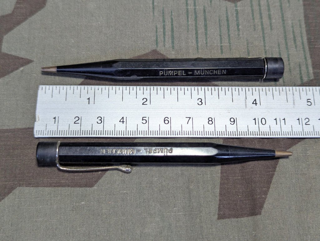 Period German Pümpel München short mechanical pencils.Price is for one.Both are basically out of lead, but are mechanically functional. If you replace the lead you would have a rather nice pencil. The metal clip piece is a little loose and floppy.
