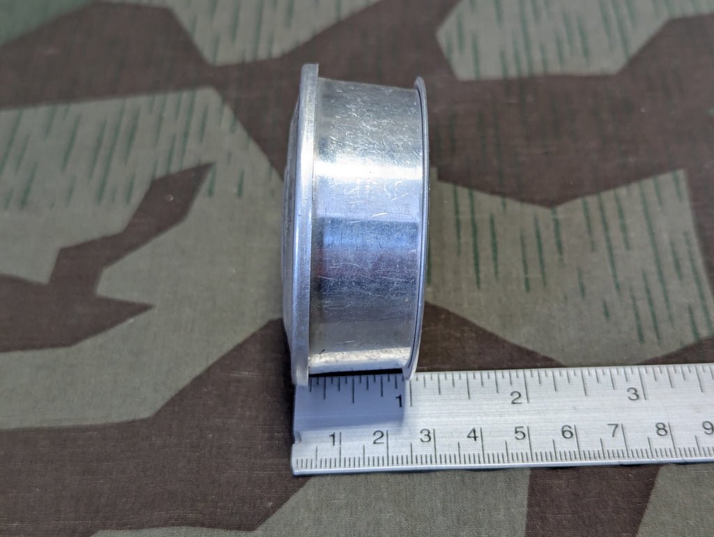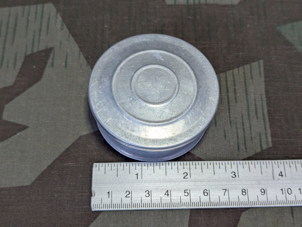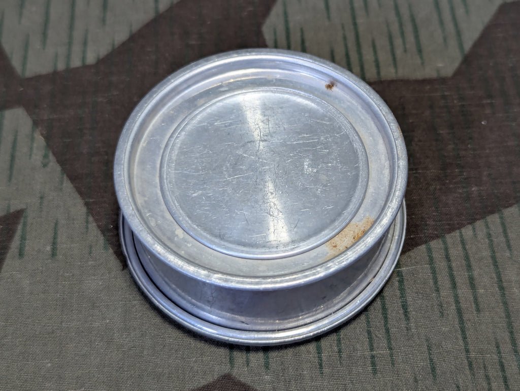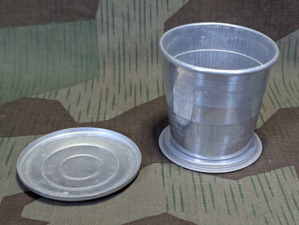 Vintage aluminum folding cup with the original lid / cover. Nice pocket size camping accessory. These collapsing cups were popular in both Germany and the US and are featured in many period camping supplies books. It needs a cleaning, but is in otherwise good condition.This style cup is pictured on the cover of the 1939 Der Sportler catalog.