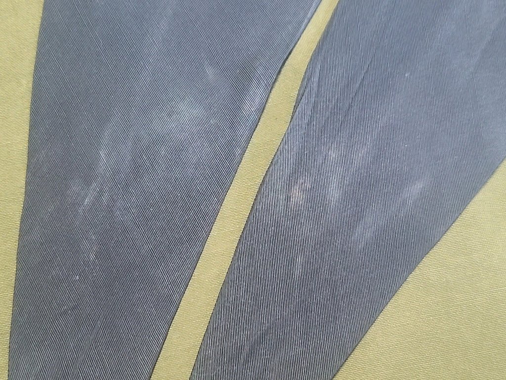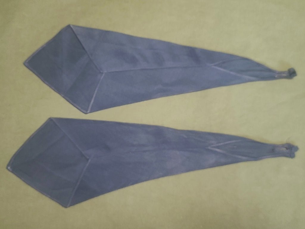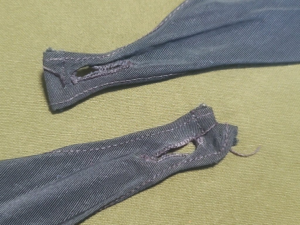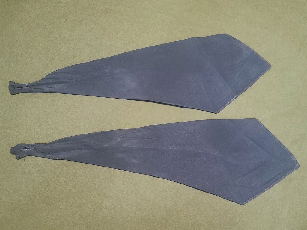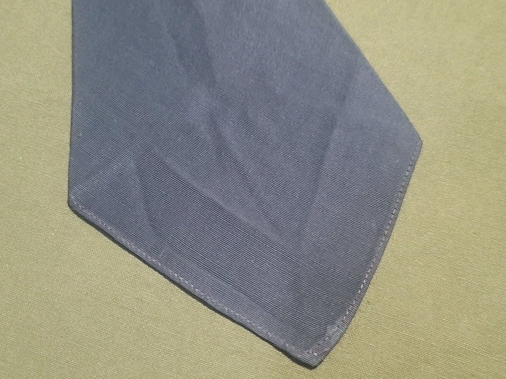 Vintage WWII US Navy WAVES black (or exceedingly dark blue) two piece tie. This two piece style seems to be the more common wartime one (although one piece ties did exist). Some smudges (possibly from an iron), but overall good condition.This tie was worn with the white shirt, the reserve-blue shirt and the seersucker working uniform. It was worn under the shirt collar with the knot placed at the collar opening and the tie ends tucked under the collar tips.