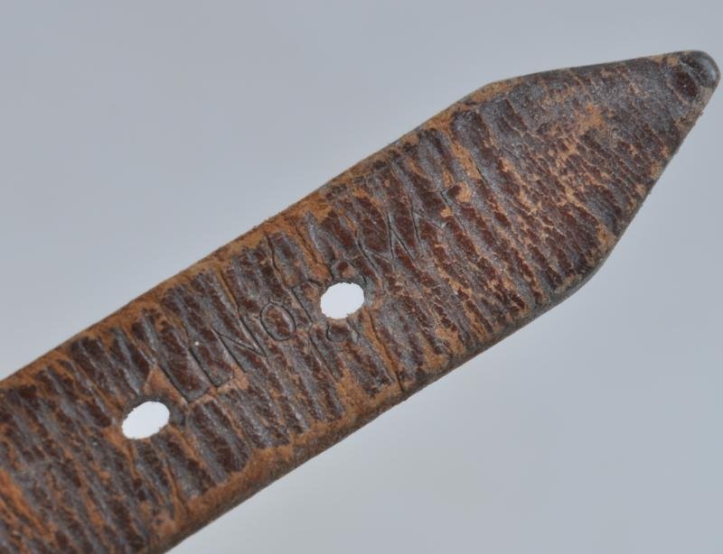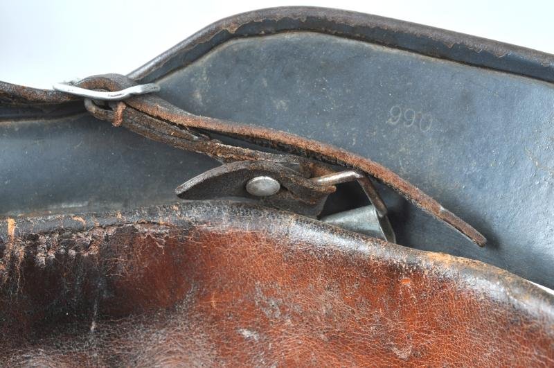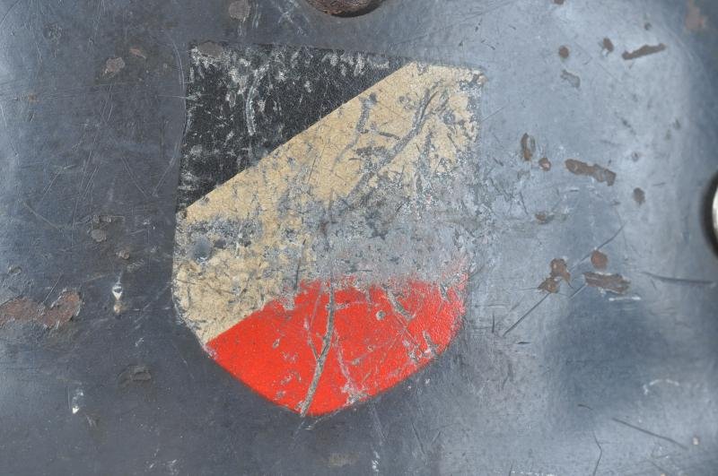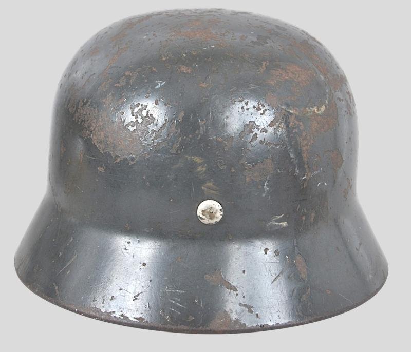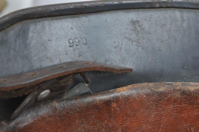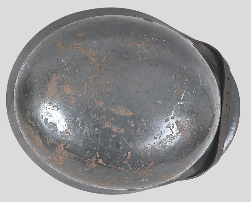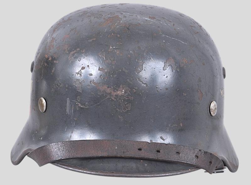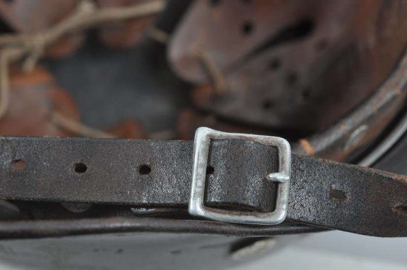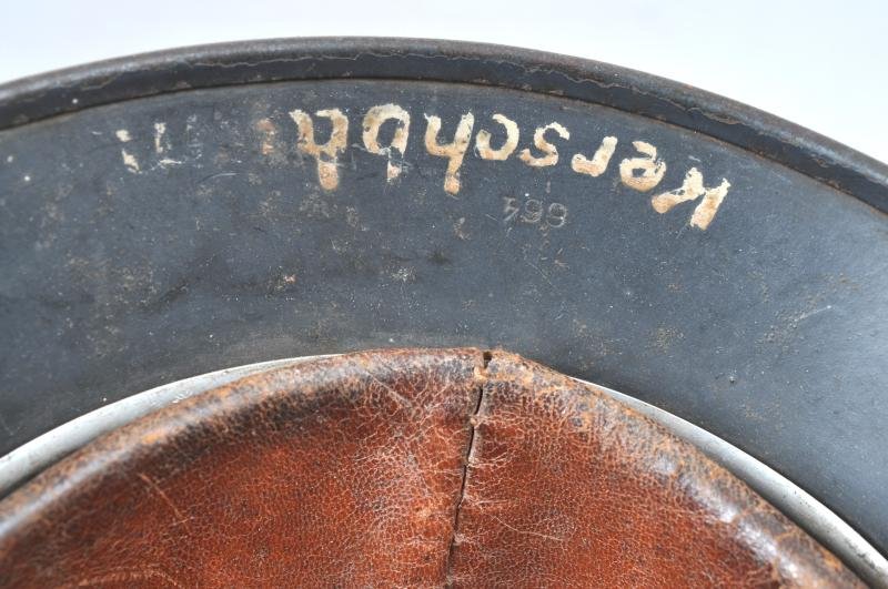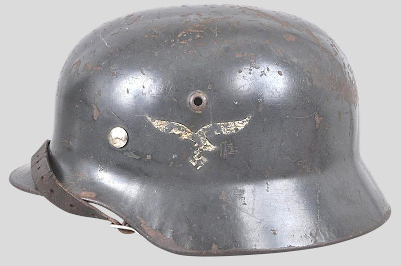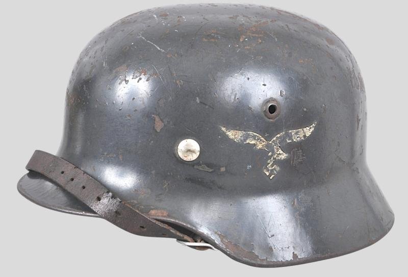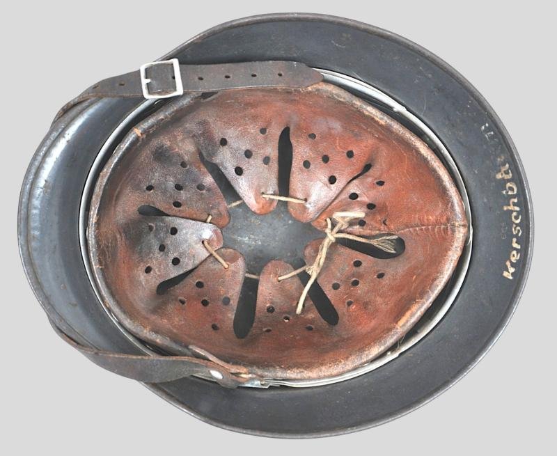 An untouched M35 Luftwaffe double decal combat helmet coming complete with its original chinstrap.Factory painted in luftwaffe blue smooth paint of this early period both decals are still very much present with wear overall to the entirety of the exterior. Underside rim bears the size & maker of 'Q66' for the firm Quist & the batch number 664. The original soldiers name of what appears to be ' Kerschbaum' is handwritten to the rear . This can also be faintly see on the leather liner & with this & the undisturbed liner pins taken into account we can be sure that this liner has never been out of the helmet. Liner complete with original tightening string. The reinforced aluminium liner band is dated 1939. The brown leather chinstrap bears a maker name to its tip , please see picture.Overall good combat example with original chinstrap.