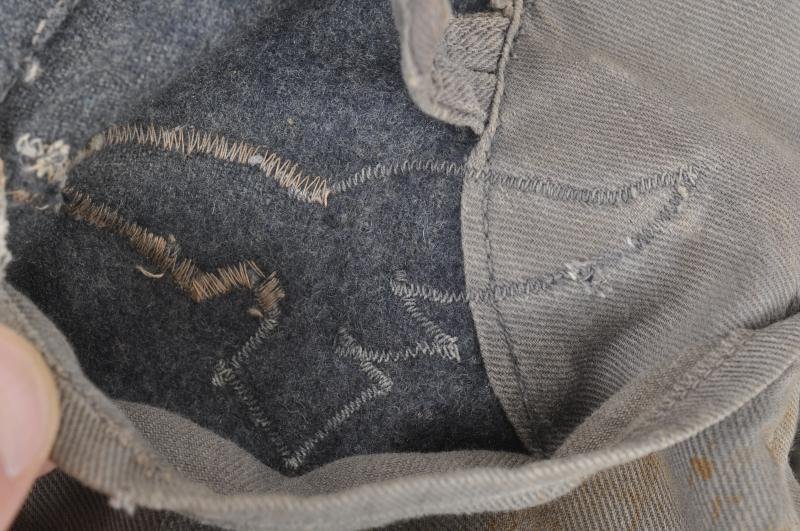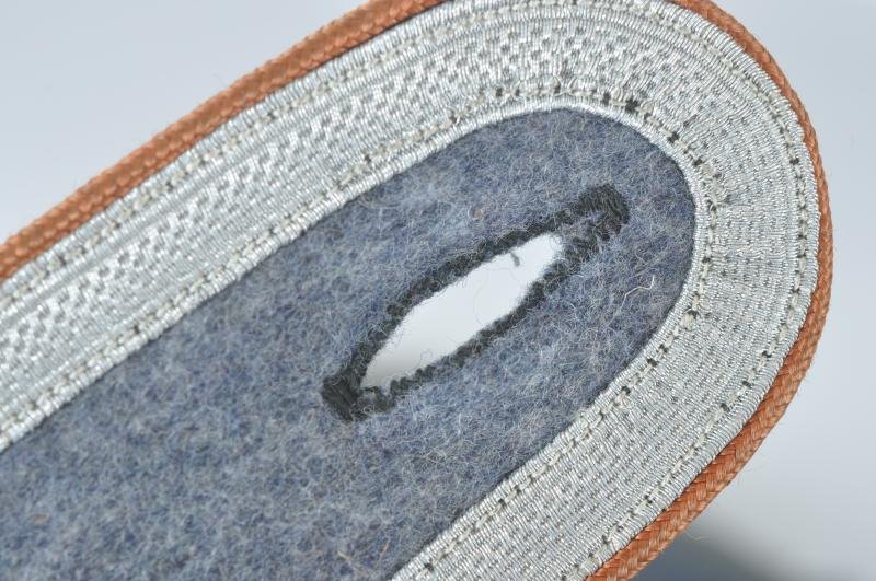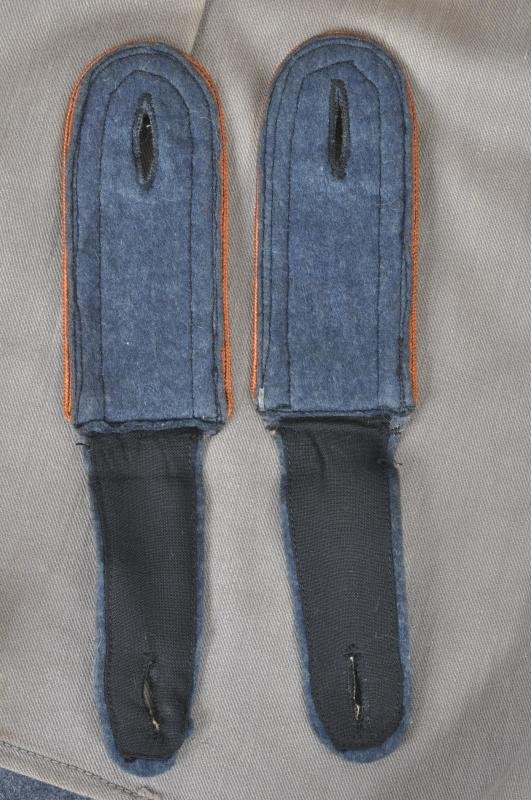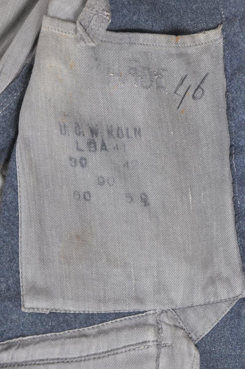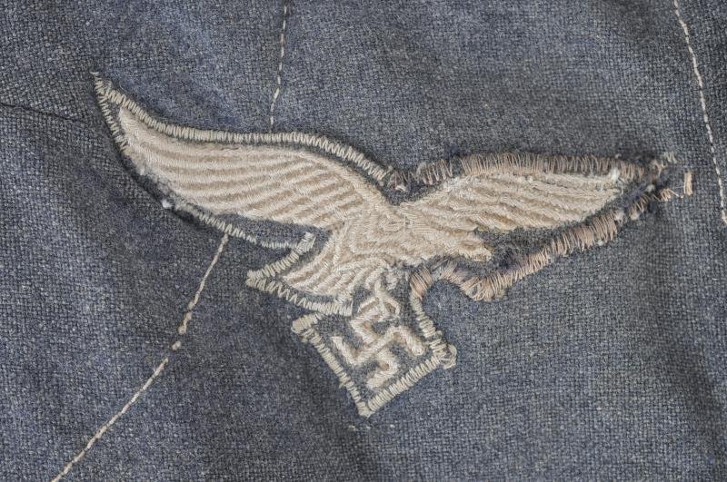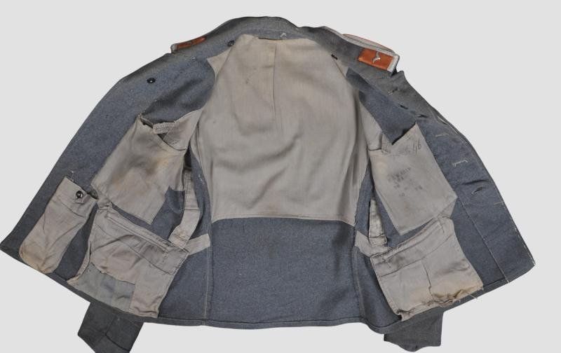 German Luftwaffe NCOs 'Fliegerbluse' with brown branch piping for signals troops & rank tresse for Unteroffizier ( Sergeant ) .This is the model of 'bluse' seen from around 1940 onwards & with its original brown collar tabs with silver tresse around collar & shoulder boards denoting NCO rank. The single gull to each tab with no rank chevron to sleeve confirms the rank of Sergeant. Each cuff has adjustment tabs this feature not seen on later produced examples. The embroidered breast eagle is zigzag stitched with an apparent old repair to one wing of the stitching which is most likely wartime executed. With a concealed fly front one of these buttons is replaced & the hook & eye collar fastening is still intact. Interior lining is in grey cotton twill with LBA inspection stamp ( Luftwaffe Bekleidungs Amt ) & dice marked sizes.An overall nice 'salty' fliegerbluse' from one of the lesser seen branches of service.