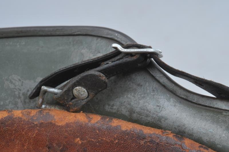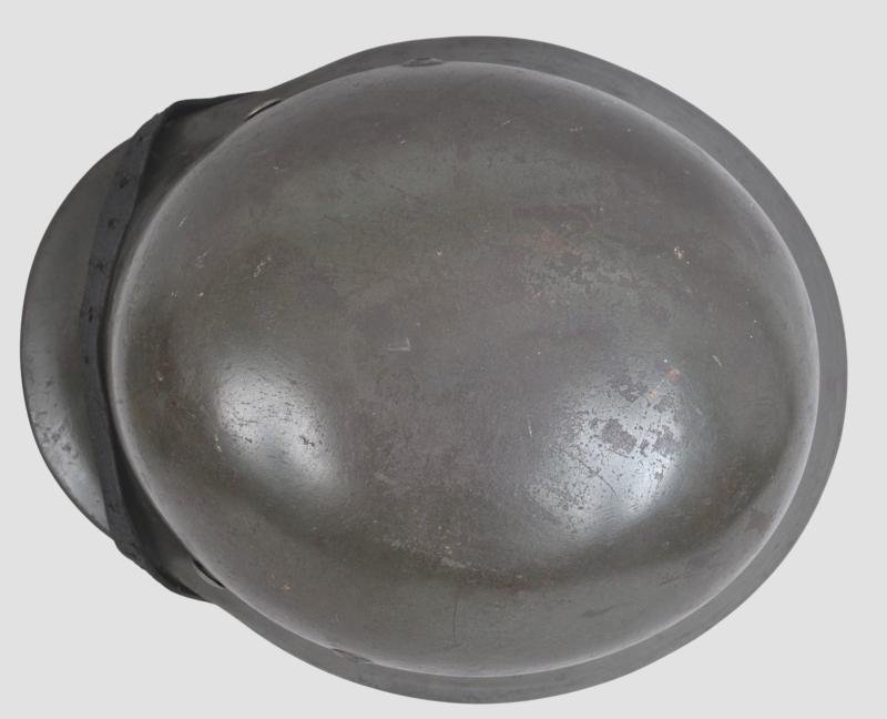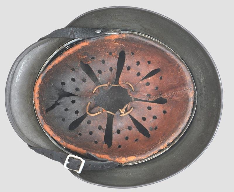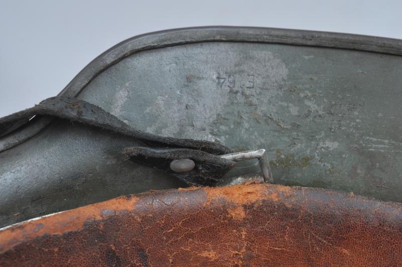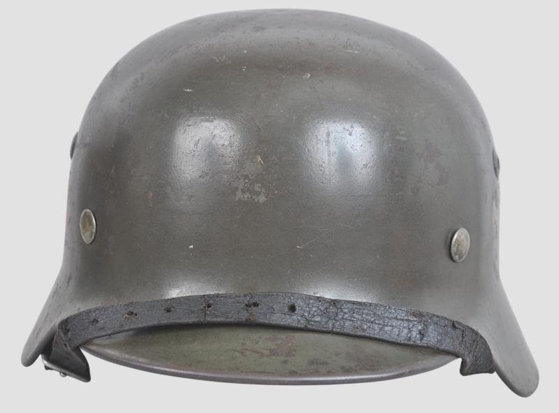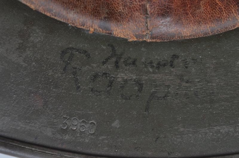 A desirable double decal army M35 helmet with a good proportion of its original apple green paint remaining. Named to a 'Hauptmann' on inside rear skirt.This M35 'ET64' helmet retains both largely intact army & tricolour decals with natural age toning & fine age crackling only seen on original decals. The apple green paint is good to inside & out with some natural service wear & scuffing to be expected on well fielded helmet. To the inside rear skirt is a handwritten name with rank abbreviation 'Haupt' for Hauptmann ( Captain ) . The 'ET' (Eisenhutten) marked helmet shell has the size '64' with lot number '3960'. Liner band is aluminium reinforced & dated 1939. Leather liner shows service wear with a tear to forehead area where there is some dark staining possible indicating a casualty helmet. Original drawstring still present. The aluminium buckled chinstrap is intact.