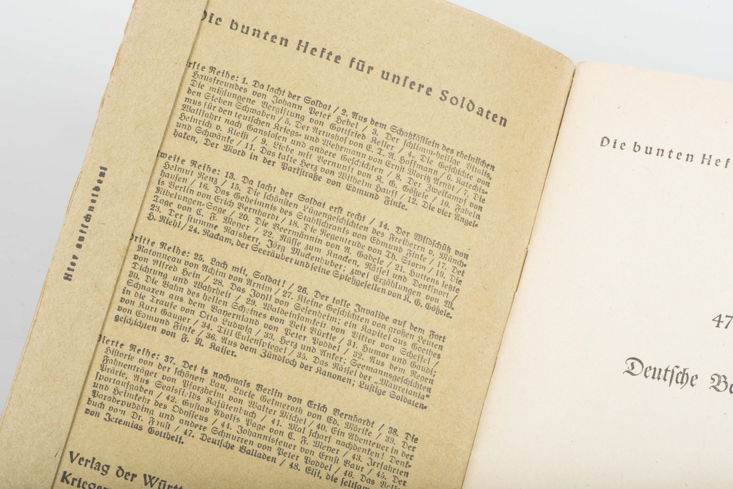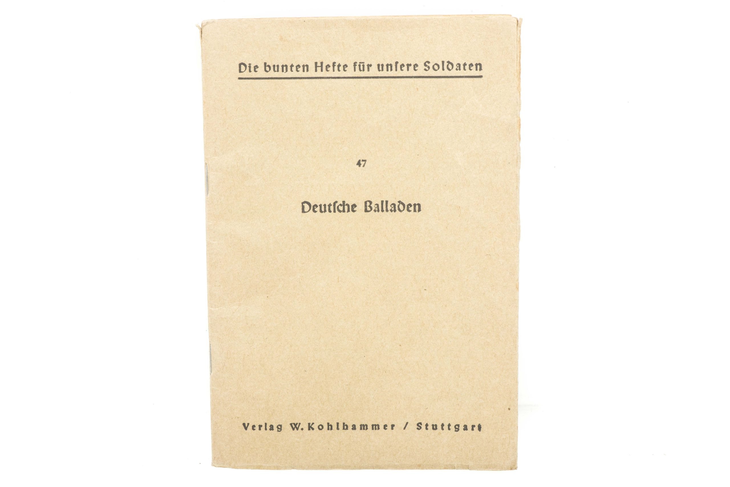 Nice original German soldiers song book in very good condition. 47 Deutsche Balladen is a part of the Der bunte Hefte fur unsure Soldaten series which are rather hard to find. Nice Feldpost sized example!