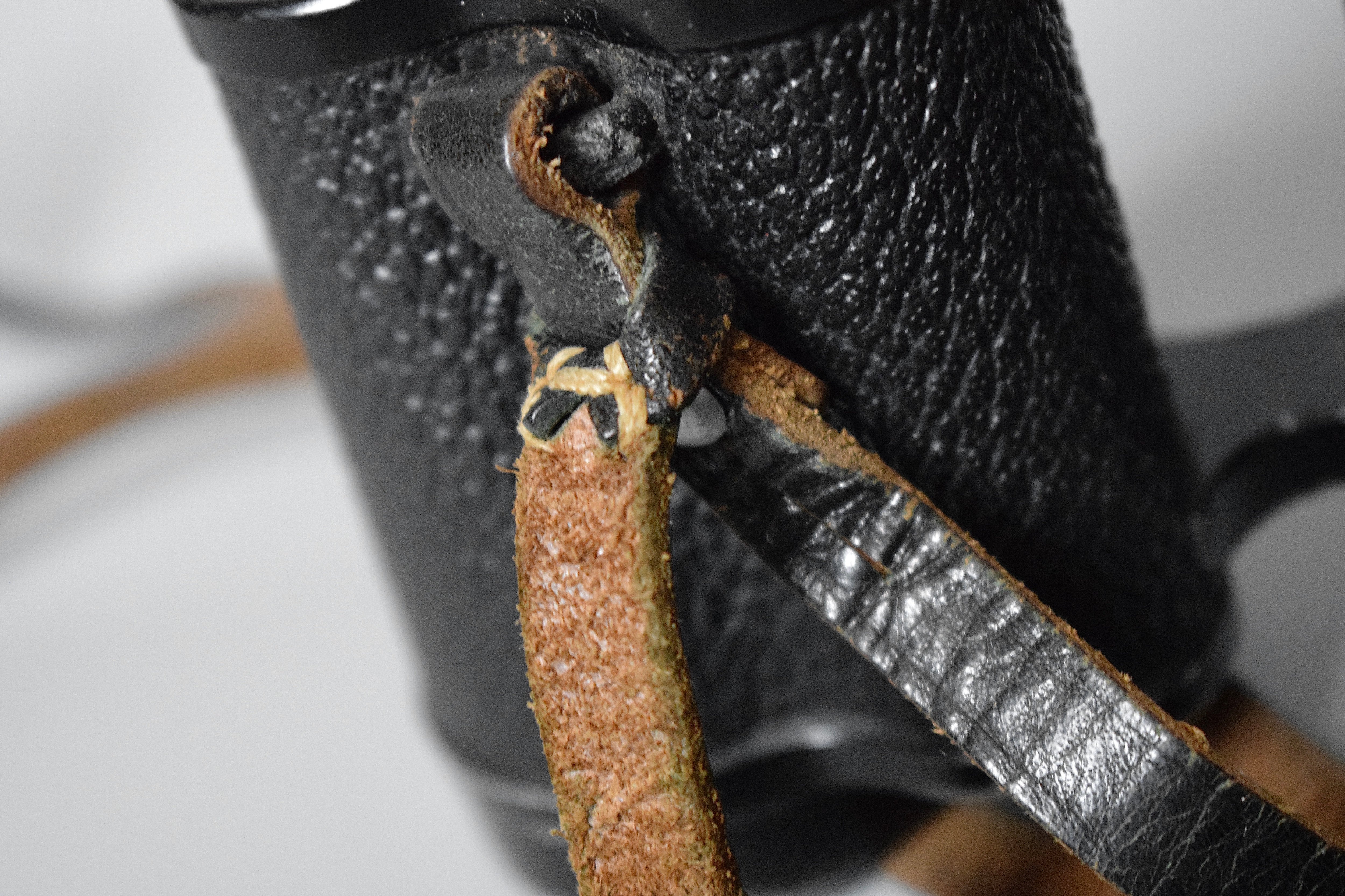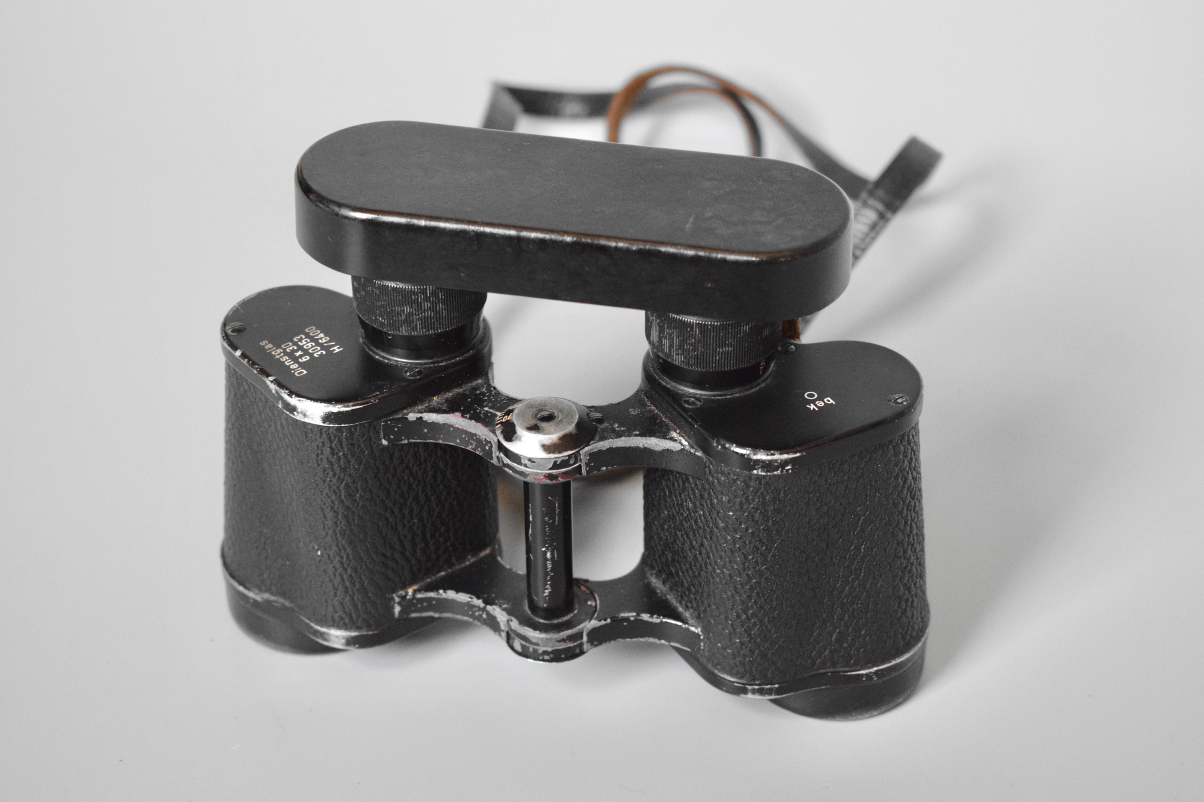 A nice original example of an early-war variation of 6x30Dienstglas,produced under the 'bek' maker code byHensoldt-Werk fur Optik und Mechanik, Herborn.This pair are finished in the original black paint with leatherette barrel coverings.They also still come fitted with their original accessories - inclusive of a very nicely 'WaA' proofed Bakelite ocular cover and leather neck strap.The optics produce nice usable image, and with the H/6400Strichplatterangefinder reticule still intact!