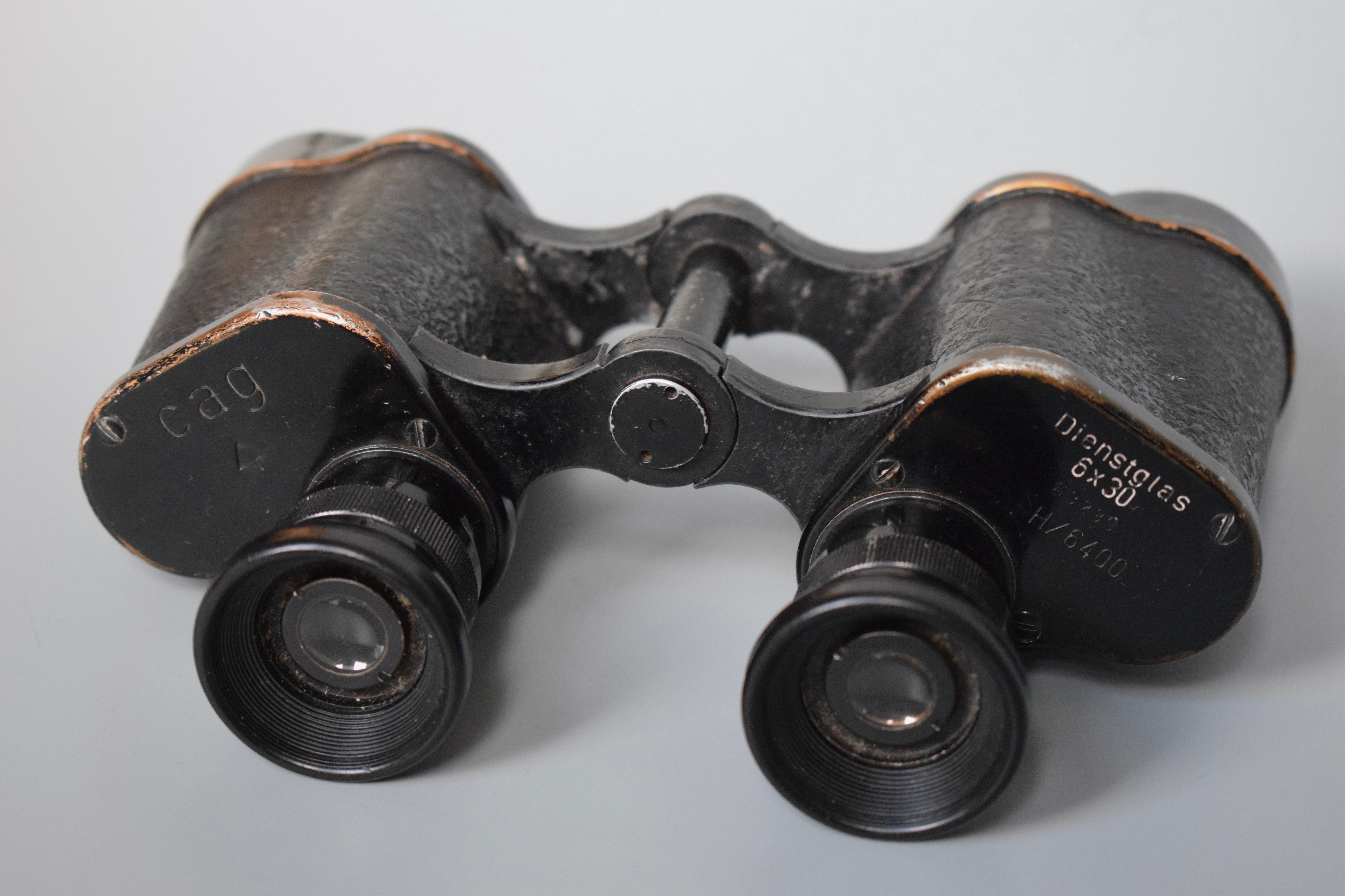 A very nice pair of 6x30Dienstglasbinoculars which were manufactured bySwarovskiunder the 'cag' maker code.They still retain much of the original black paint over an anodised finish etc, whilst showing clear signs of combat usage.The optics produce a clear and usable image.