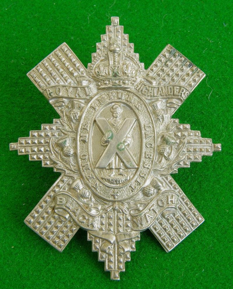 Scarce king's crown white metal glengarry badge with two long {Bent inwards} loops to the reverse worn by the 4th.,5th.,6th., and 7th,Territorial Battalions Black Watch. St. Andrew upon the Star of the Order of the Thistle with double scrolls bearing the titles, ' Royal Highlanders' and ' Black Watch' with no sphinx and Egypt honour.