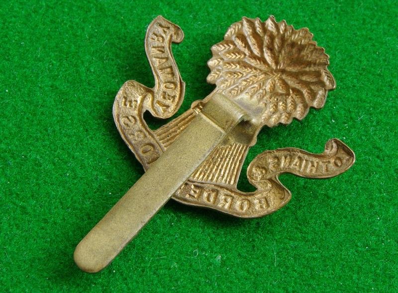 Very scarce short lived brass cap badge with slider fitting to the reverse. A sheaf of wheat above the furled title scroll, ' Lothians & Border Horse Yeomanry'