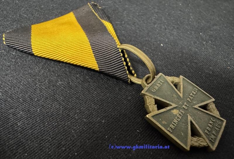 k.u.k. Armee-Kreuz 1813/1814 - Kaiser Franz I. !! - sogenanntes Kanonenkreuz - aus Geschützbronze - Münzamtstempel (Doppeladler in der Raute) in der Öse am oberen Kreuzarm - grün lackiert (80%) - am originalem späteren großen Dreiecksband vernäht (ca. 1890/1900) - sehr guter gebrauchter Zustand!