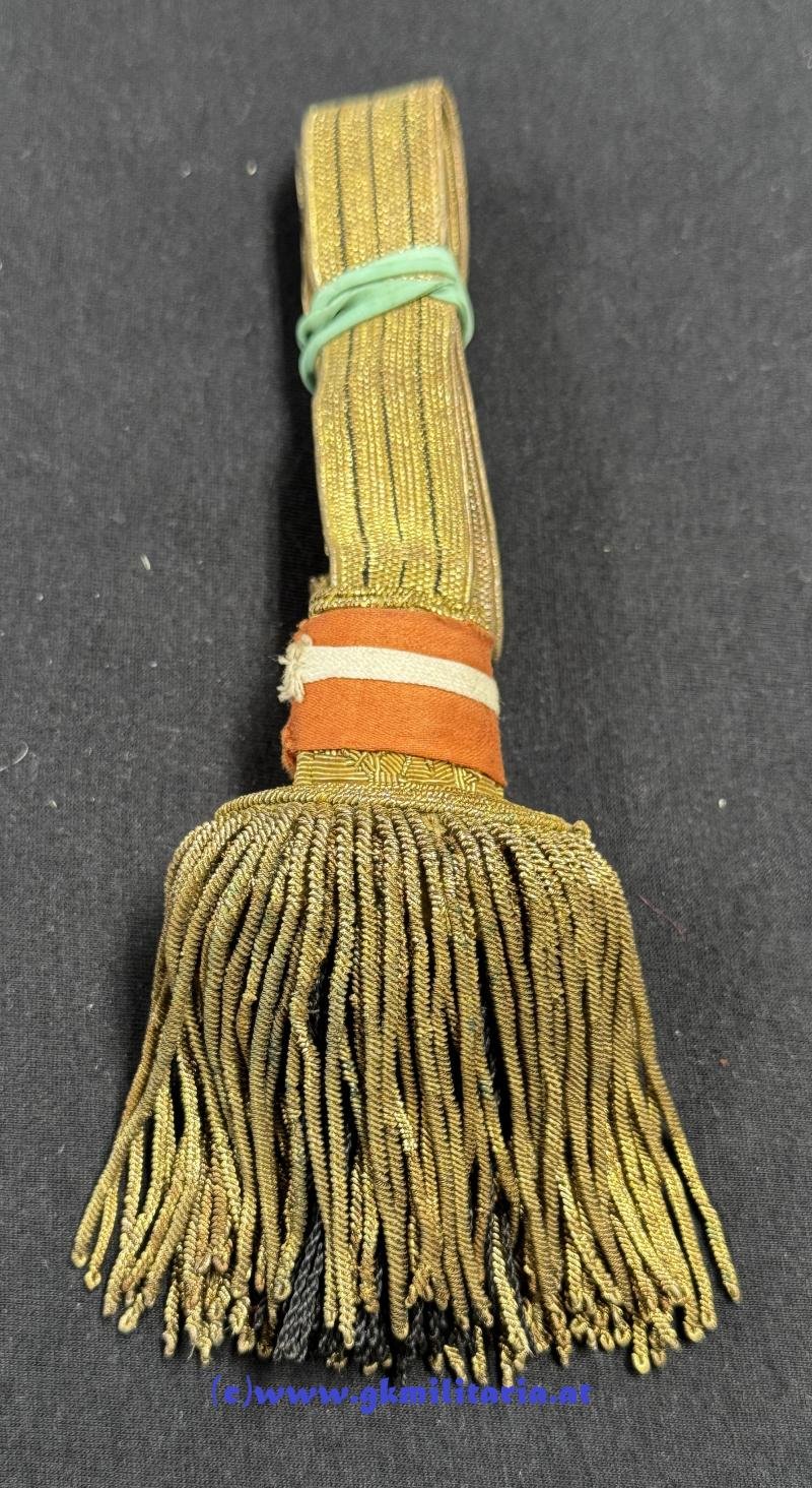 Portepee SĂ€bel fĂŒr Offiziere 'VOLKSWEHR' !! - das Portepee stammt aus der k.u.k. Armee - Doppeladler und allerhöchster Namenszug FJ I. mit rot weiĂ rotem Stoffstreifen ĂŒbernĂ€ht - Innenseite mit Leder (teilweise NĂ€hte offen) - Band mit 2 kl. Einrissen sonst guter gebrauchter Zustand!
