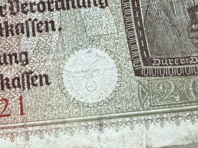 Circulated 100% original bill with Nazi eagle and swastika.