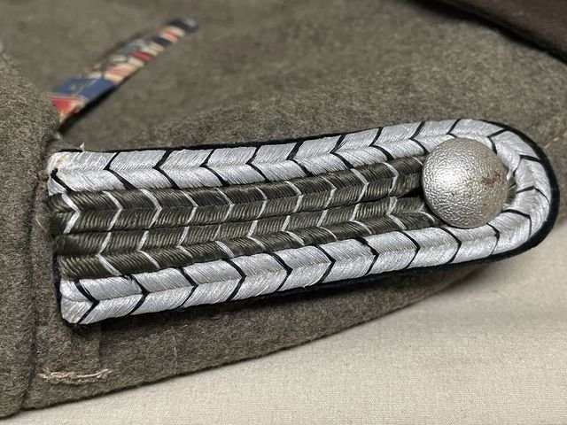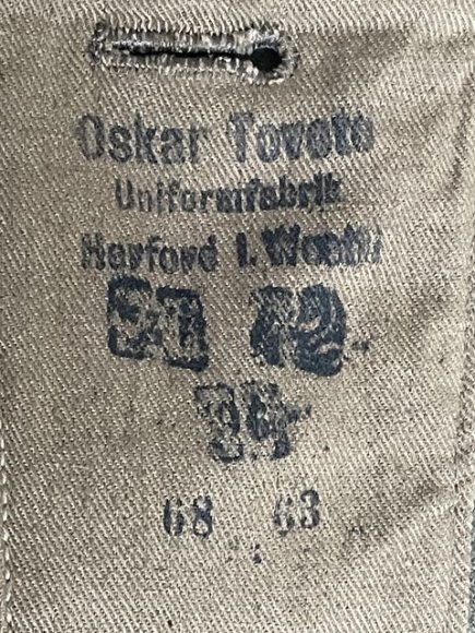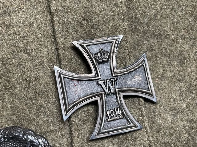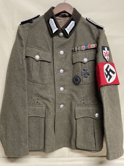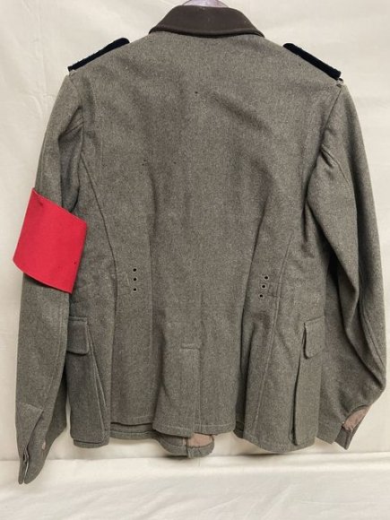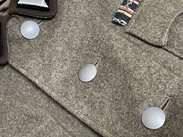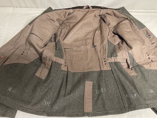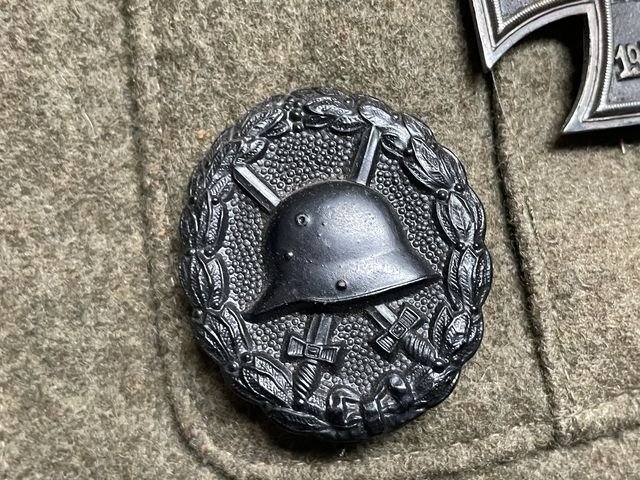 Nice 100% original tunic that is size marked. Includes an RZM tagged arm band, 1914 Iron Cross 1st Class, black wound badge and 8 position ribbon bar! There is a small amount of mothing.