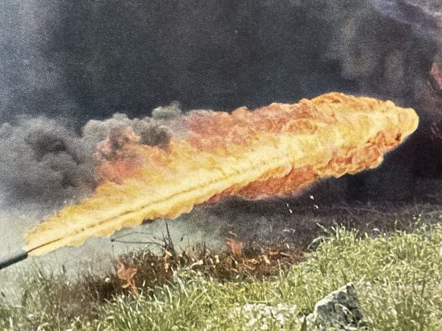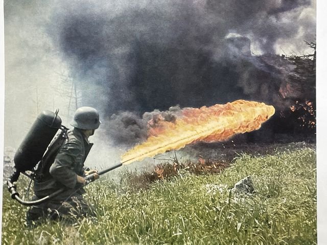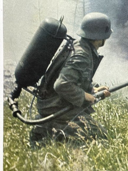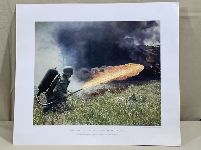 Original WWII German Military Themed Color Print, Pionier with Flamethrower Attacking