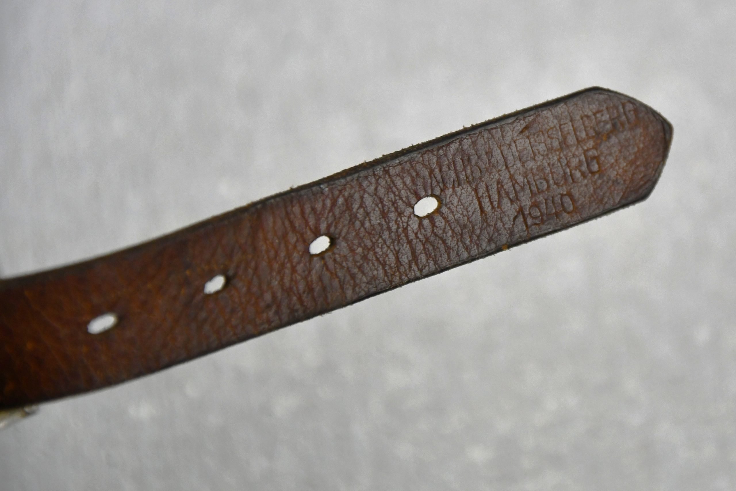 Genuine helmet chin strap in light worn condition. Aluminum buckle. Maker marked by Sachs & Deisselberg, Hamburg dated 1940.