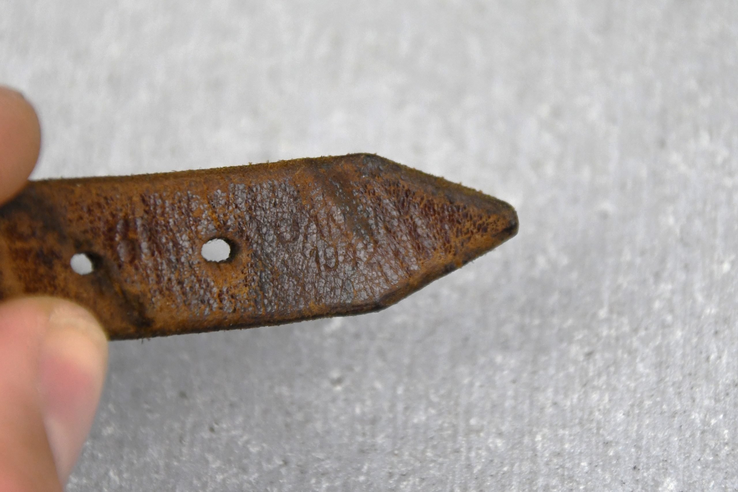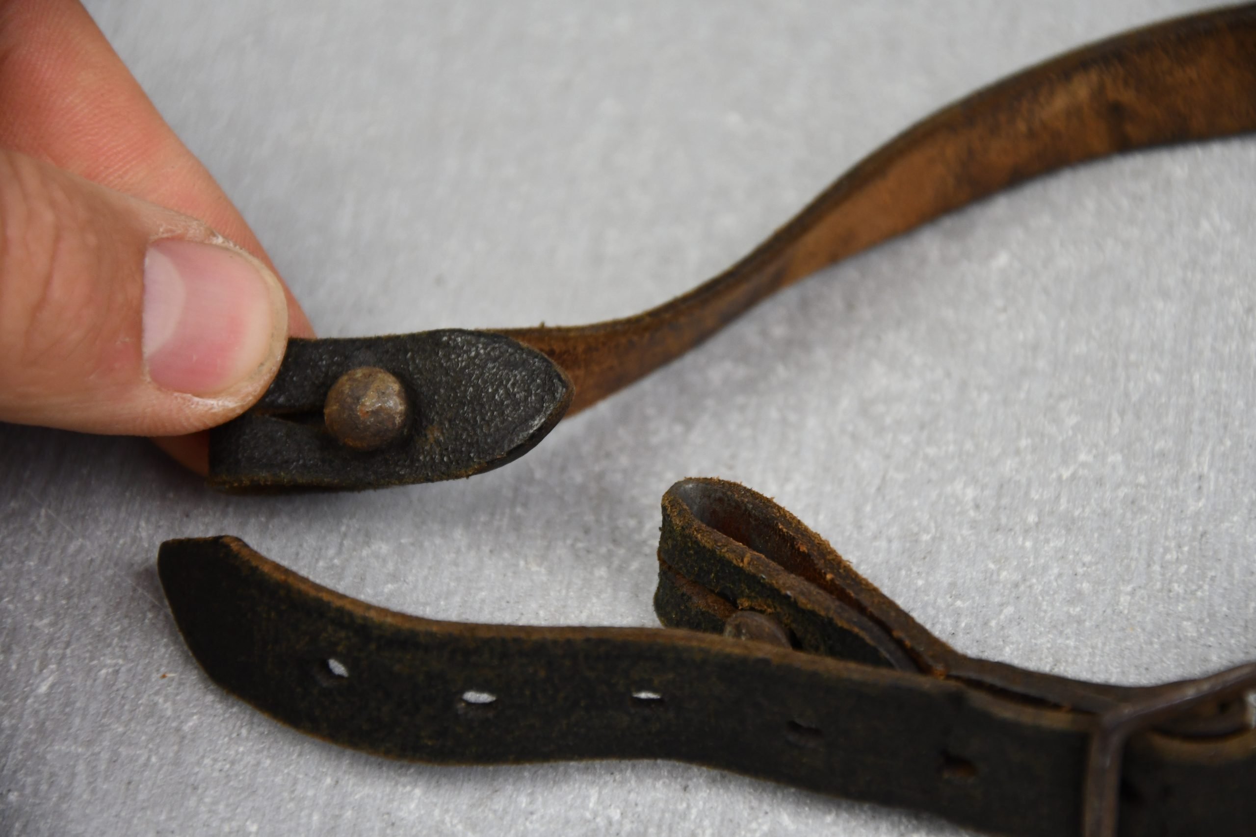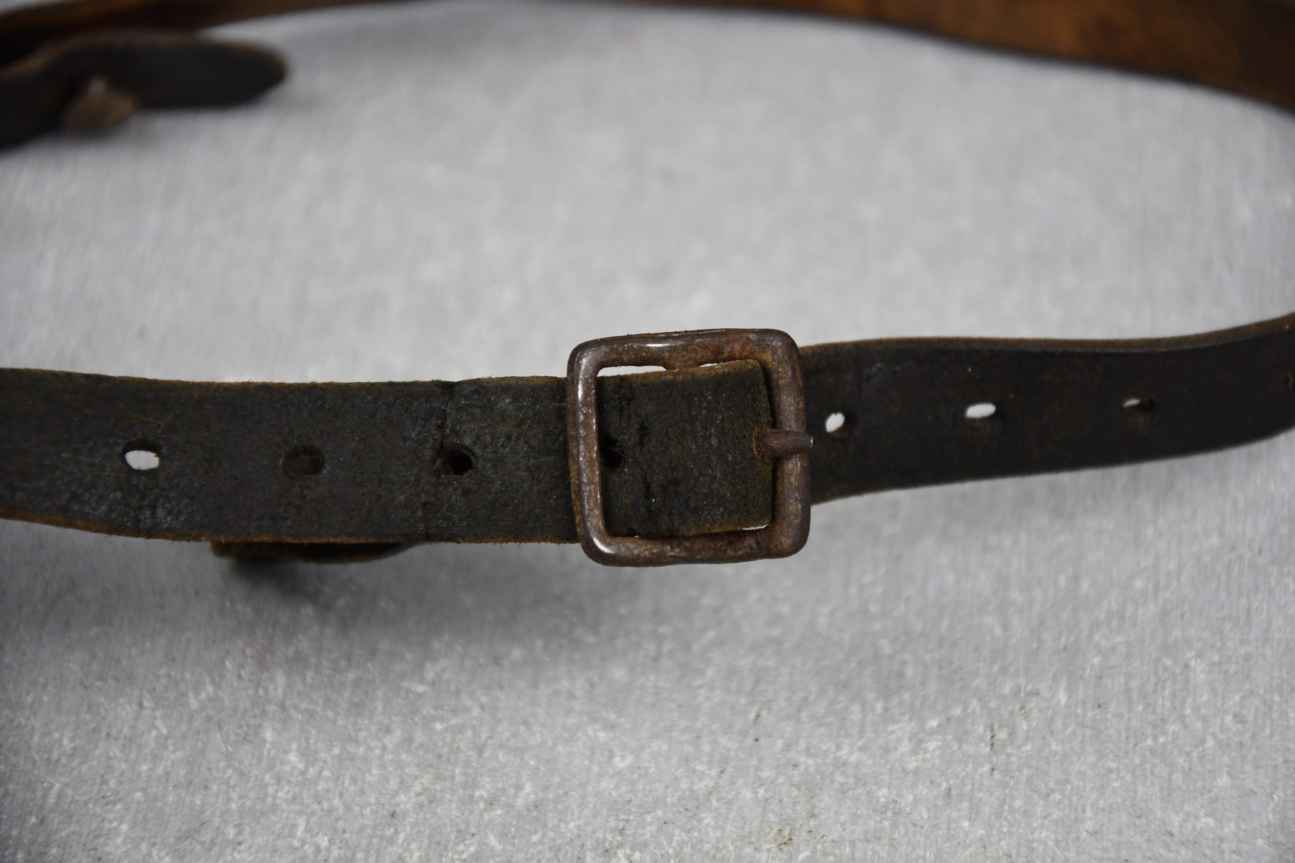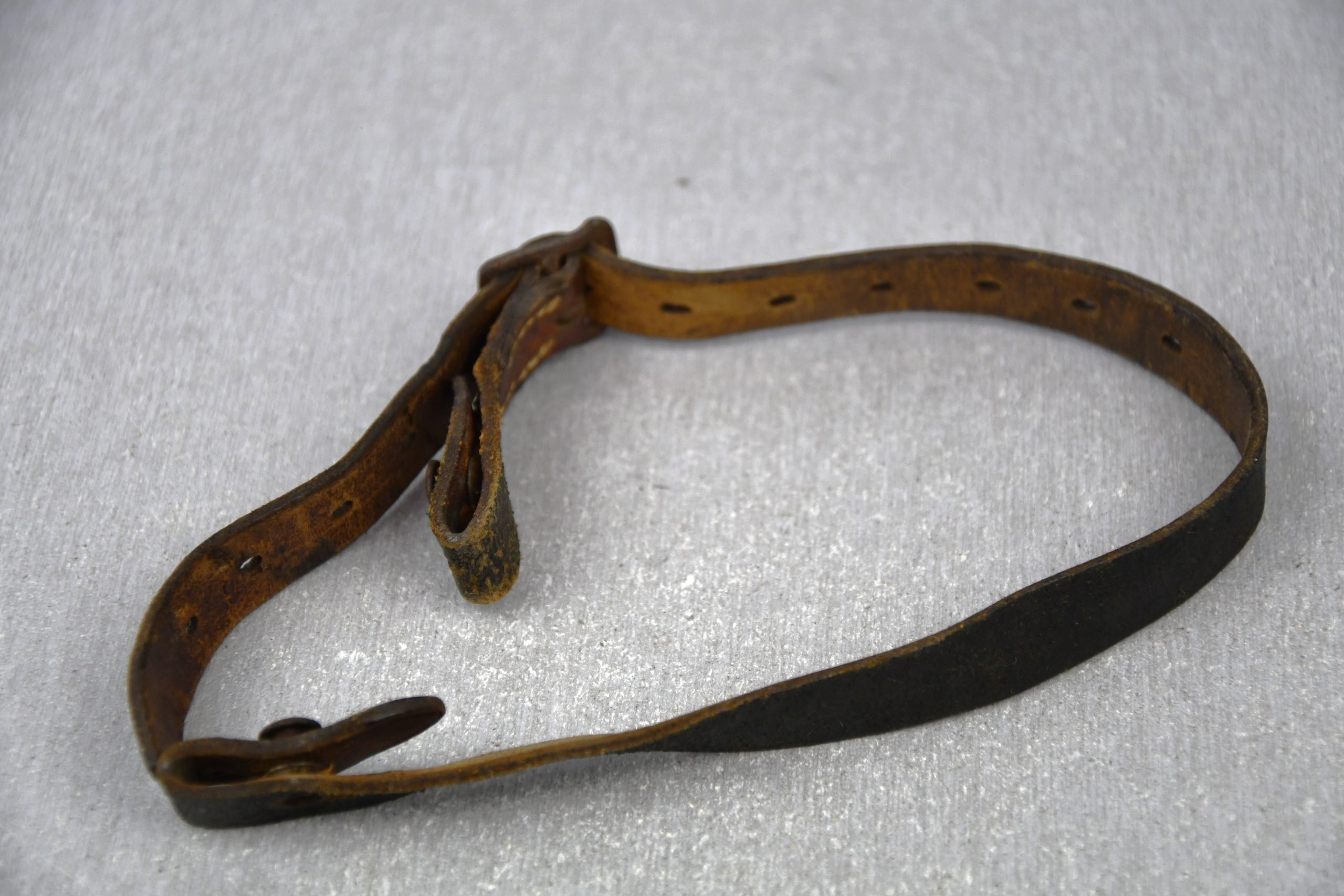 Genuine helmet chin strap in light worn condition. Steel buckle. Maker marked but I can only read 'DAN' dated 1942.