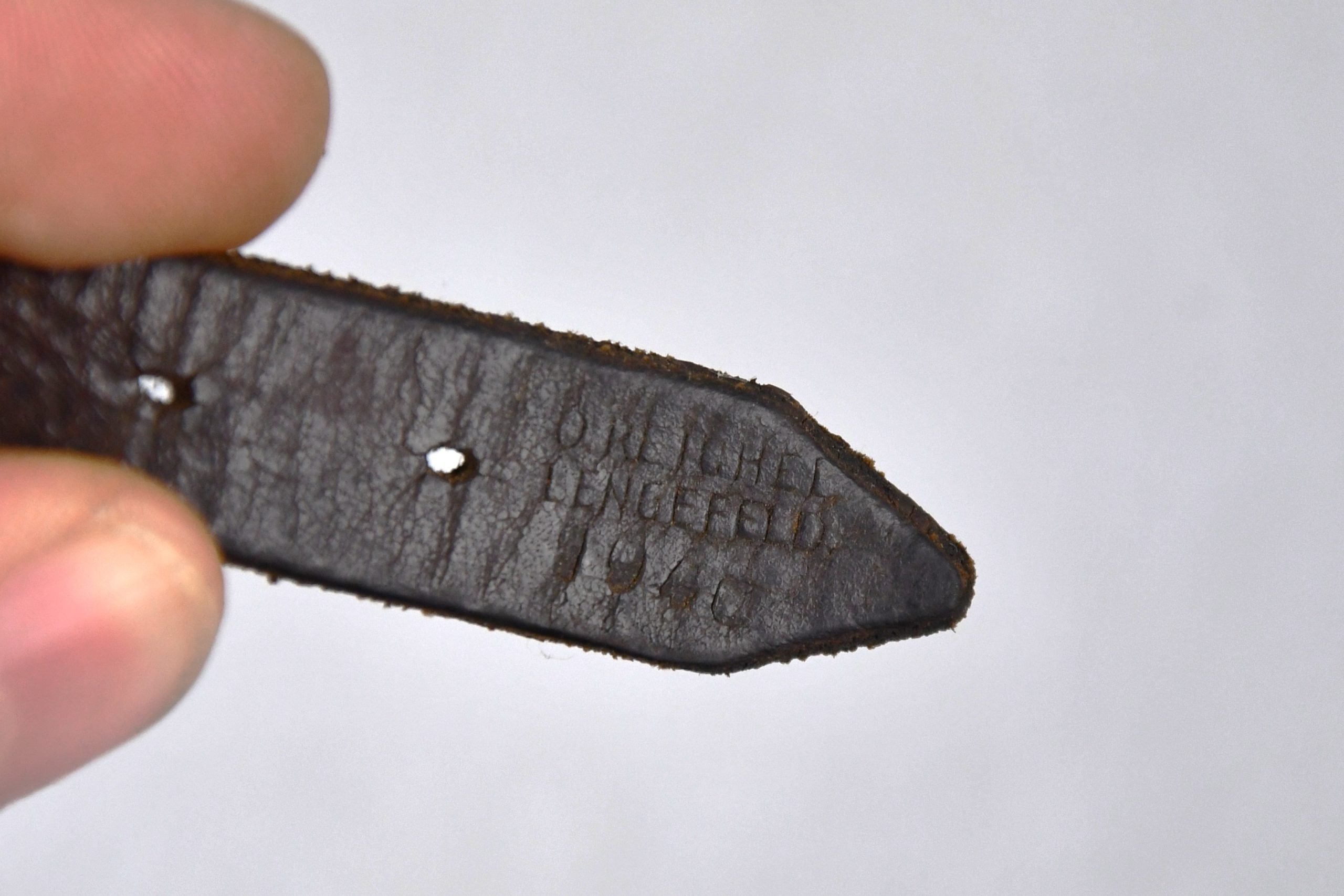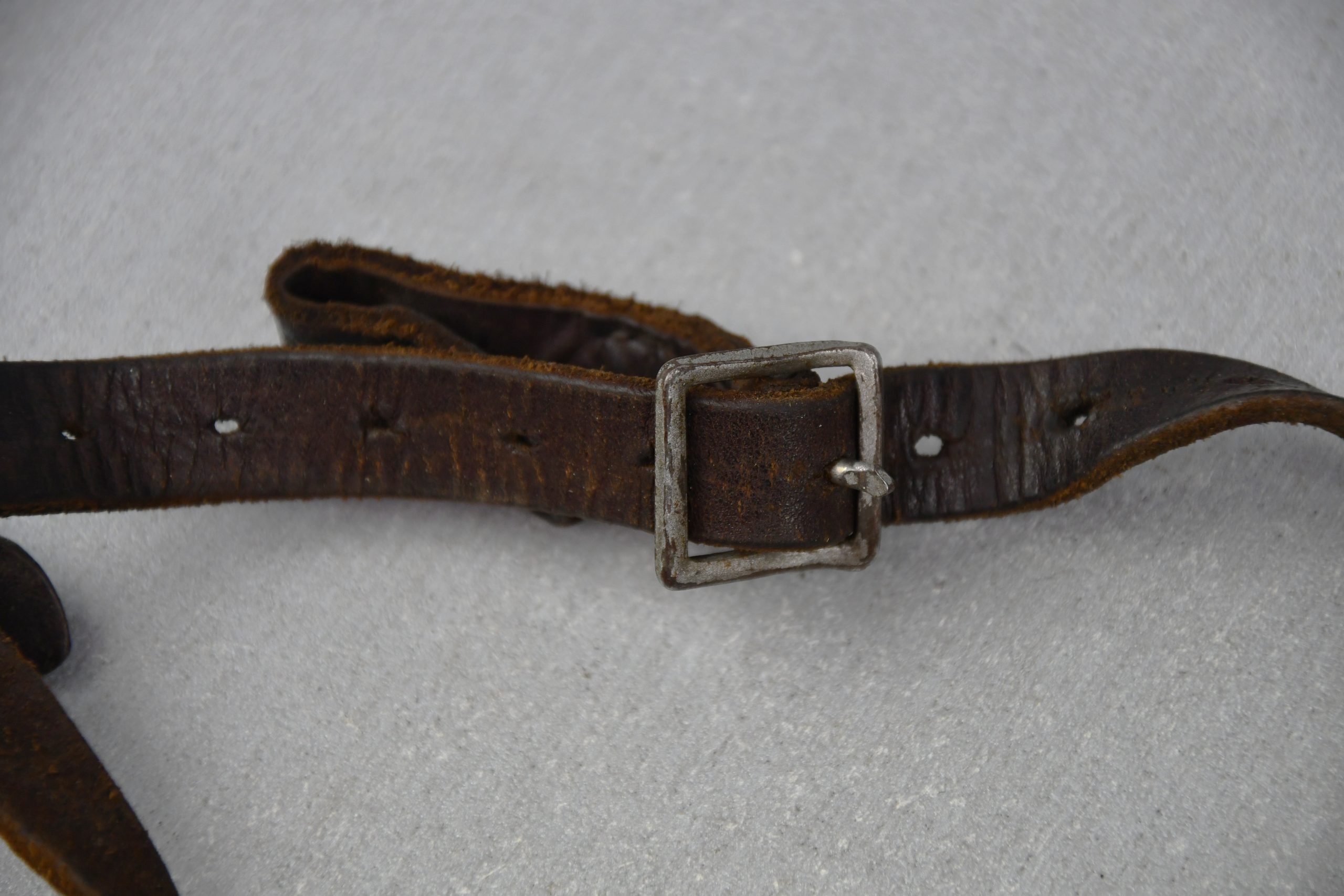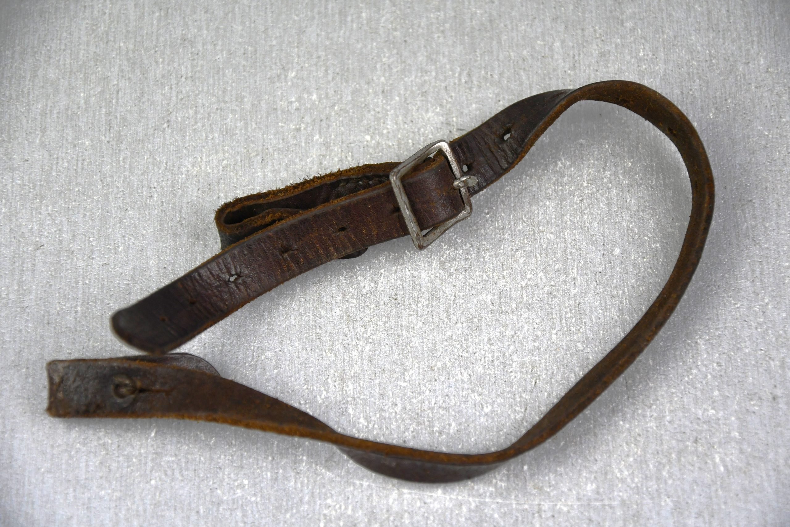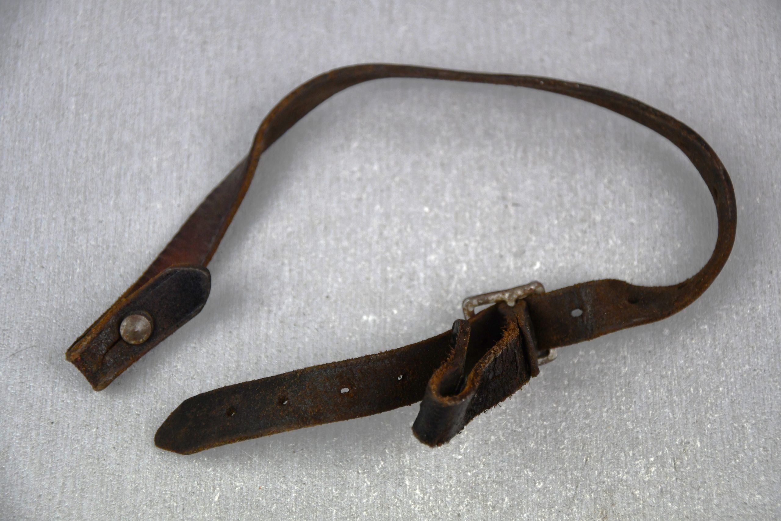 Genuine helmet chin strap in light worn condition. Steel buckle. Maker marked by O. Reichel Lengefeld dated 1940