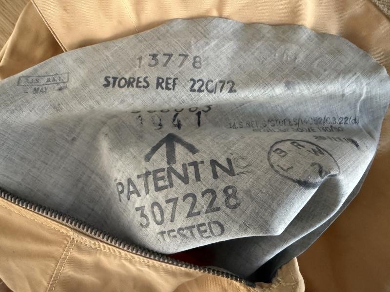 British Royal Air Force 1941 Pattern Mae West. The vest is complete with all web chest and leg ties and full working zip in the collar. Fitted with original lung in order to inflate life jacket. Fitted with a Air Ministry marked 1941 pattern inflation leaver. The Mae West is in overall nice used condition and with a great patina. Increasingly hard to find these days.
