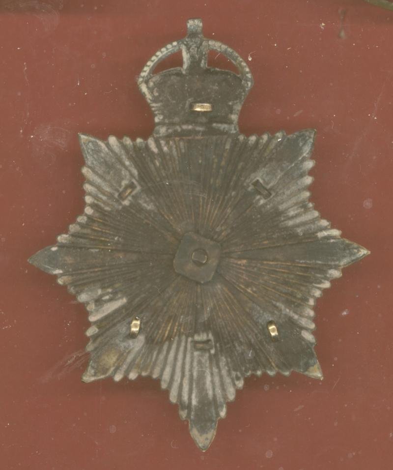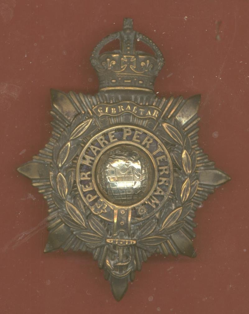 A fine post 1905 multi part construction die stamped metal example of crowned star pattern mounted with laurel wreath and scroll inscribed 'Gibraltar' to the top and fouled anchor to the junction below. Within the wreath, a voided strap inscribed 'Per Mare Per Terram' on blue enamel ground . To the centre, a silver globe in relief. Three loops to the reverse. Gilt worn GC. Ref. Personal Distinctions by John Rawlinson page 44 103