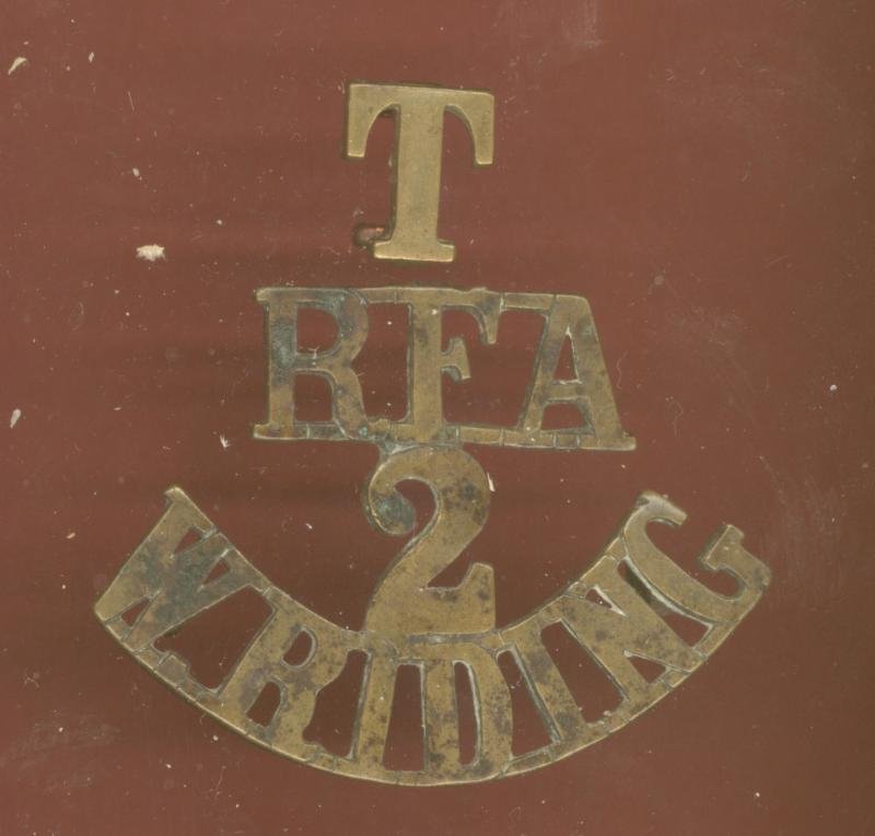 A good scarce one piece brass Territorial Royal Field Artillery 2nd West Riding shoulder title.Worn by the West Riding Batteries ,1st / 2nd West Riding Brigade Royal Field Artillery. Two loops to the reverse. Replacement 'T'. GC.