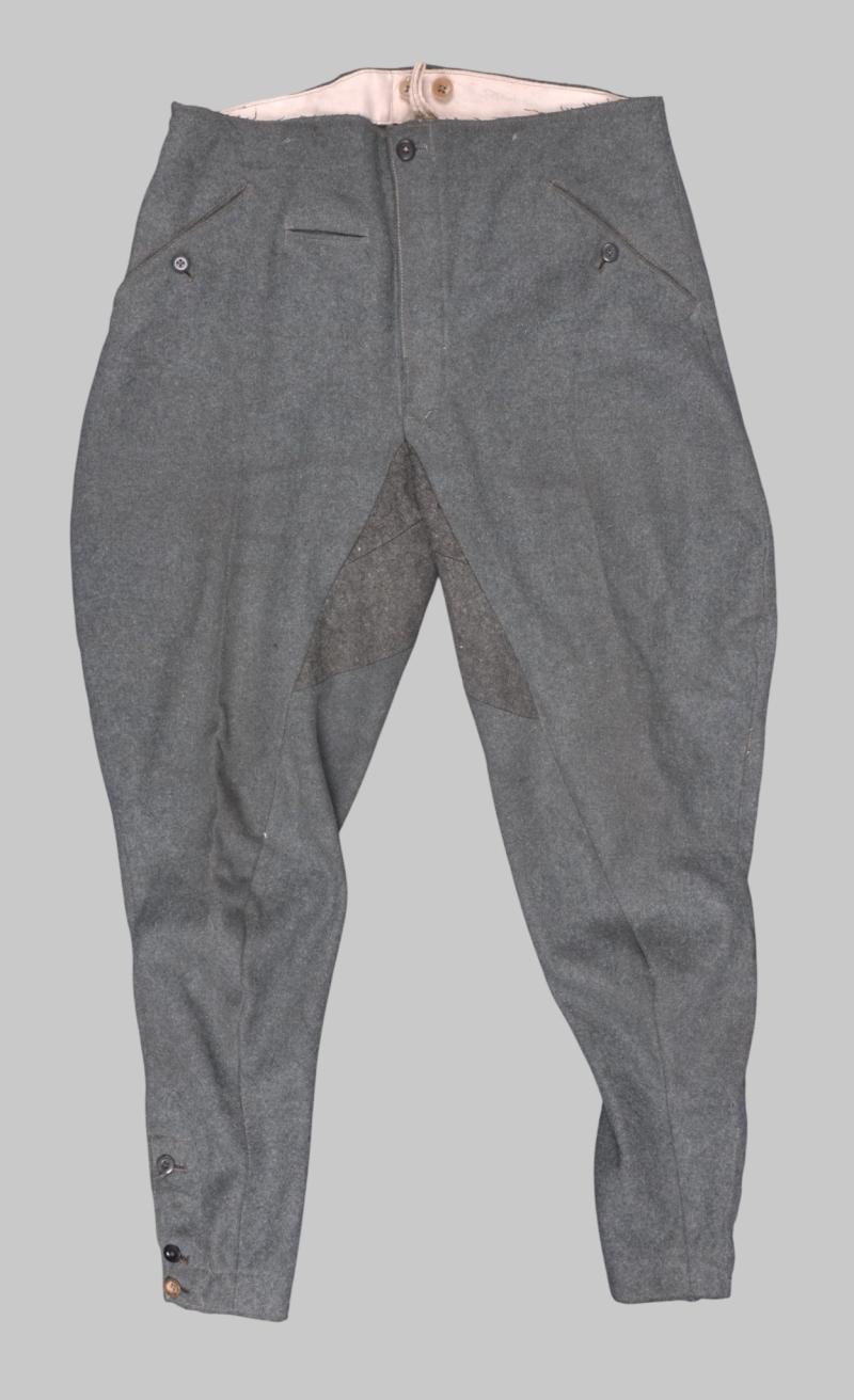 A pair of German army officer breeches modelled on the cavalry breeches & worn by many German combat officers in the field.This pair have all of their green/grey buttons intact to fly & pockets with retaining buttons for braces on internal waistband also still present. No rips or tears& ideal for mannequin display.Waist size is an approximate 32- 34in waist with an aprox 26in inside leg.