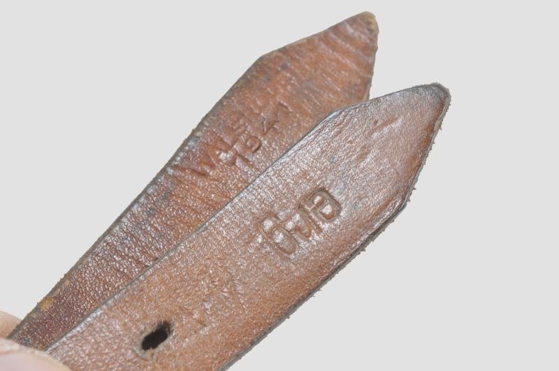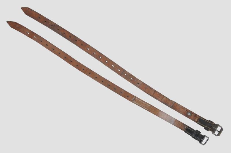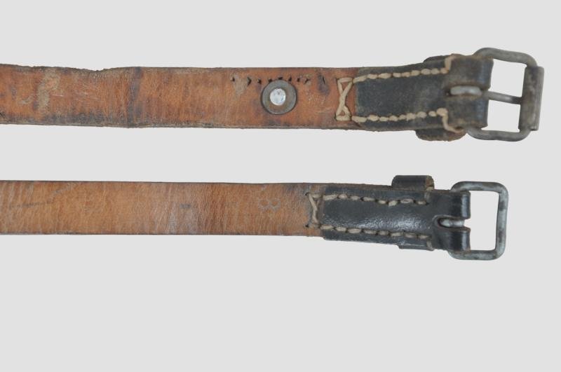 Pair of black leather , wartime dated equipment /greatcoat straps for use with combat equipment. Oner has a depot repair & the other minus its shorter strap but as used to strap onto equipment the zeltbahn , blanket , greatcoat etc.1944 & '41 dated to each strap respectively.