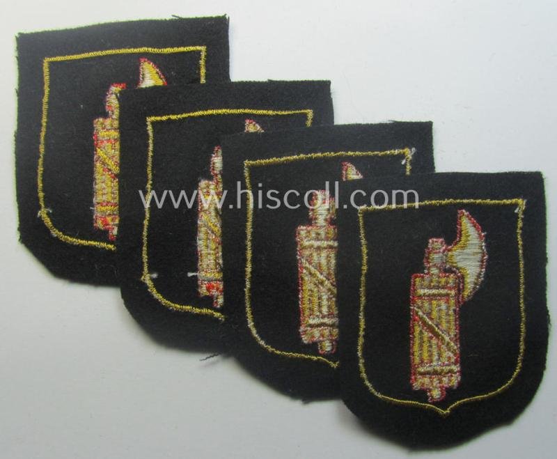 I recently uncovered four - fully identical and simply never used nor worn! - examples of the Italian-related, Waffen-SS 'volunteer' arm-shields (ie. 'Γrmelschilder') as were specifically intended for usage by the soldiers of the: '29. Waffen-Grenadier-Division der SS' ('Italienische Nr. 1' or: 'Legione SS Italiana') and that come all four in an overall very nice- (ie. 'virtually mint- ie. unissued'-), condition. The shields are depicting the golden-yellow-coloured 'Facses'-symbol ie. national symbol of Italy and come all four in an absolute stonemint- (ie. unissued and/or never tunic-attached-), condition. The shields are of the later (1943/1944-period-) type and most certainly originate from the famous 'Dachau'-clothing depots. The shields are naturally 100% original examples that originate from a US-veteran who 'liberated' these pieces in 1945. My asking-price is naturally intended per single specimen. Simply a nice occasion to acquire a 100% guaranteed original Italian-related armshield for a competitive price!