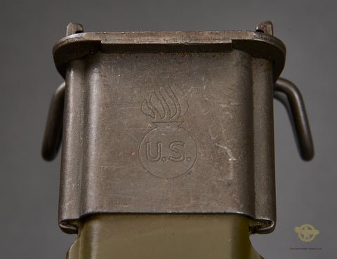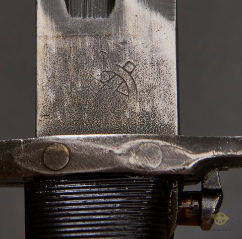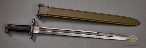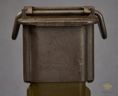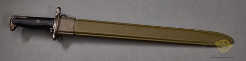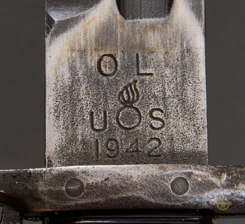US M1 Garand 1942 Bayonet-This US bayonet is a spectacular looking example. The steel pommel and crossguard have toned to a dark gray color. The black plastic grip plates are in very good condition. The rivet appears to be untouched. The plastic sheath has the early desirable victory logo with US markings inside flaming bomb. The overall condition including the blade is excellent with desirable markings. It is marked O.L. U.O.S and dated 1942. There is a maker marked on the reverse of the blade, under the crossguard that looks to be worn away. The locking mechanism functions perfectly. The M1942 bayonet was created in response to the US entering World War II in 1941. It was used on the Pacific front, where American soldiers fought Japanese soldiers with longer bayonets. This is a great offering.Online checkout is not supported for edged weapons. Please note that some items are listed as 'SOLD OUT' for this reason. All edged weapons listed on the website are available for purchase. Please contact us for any questions, or to purchase thanks!