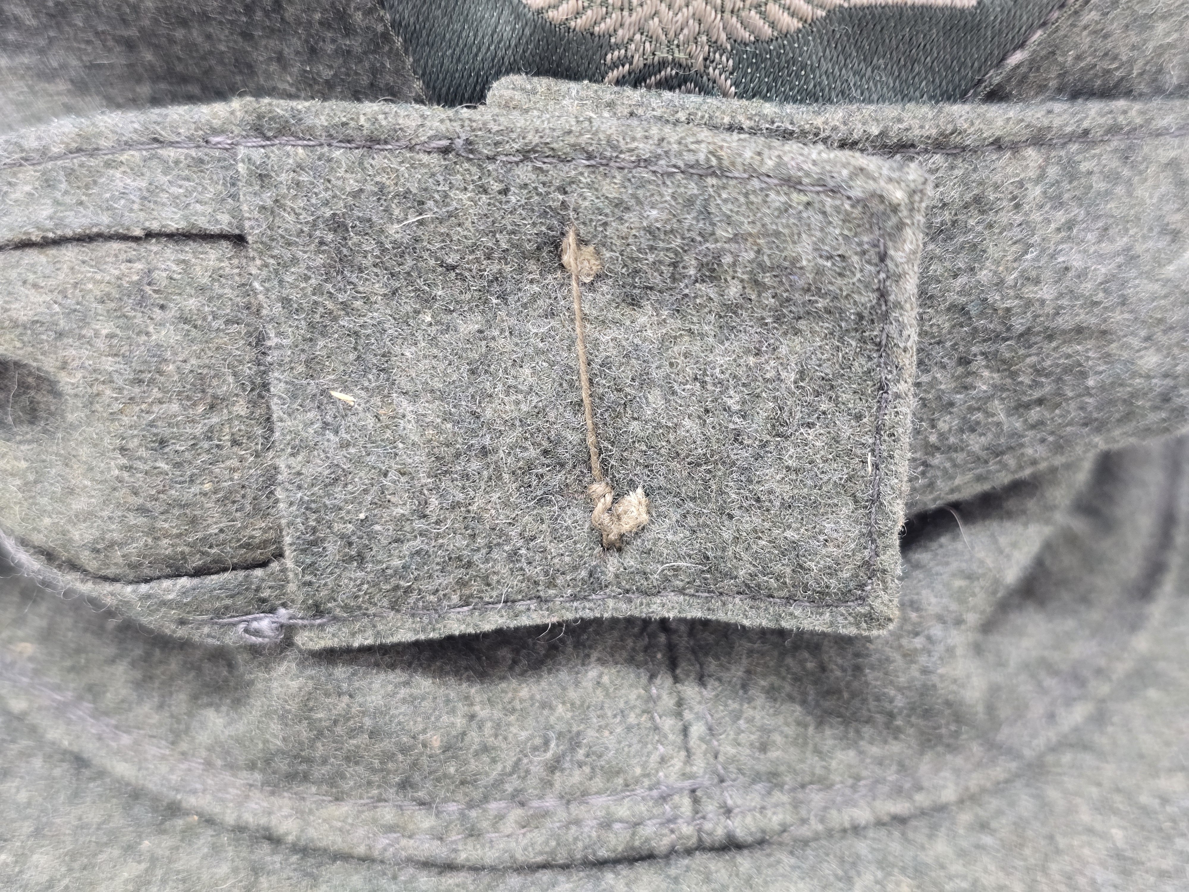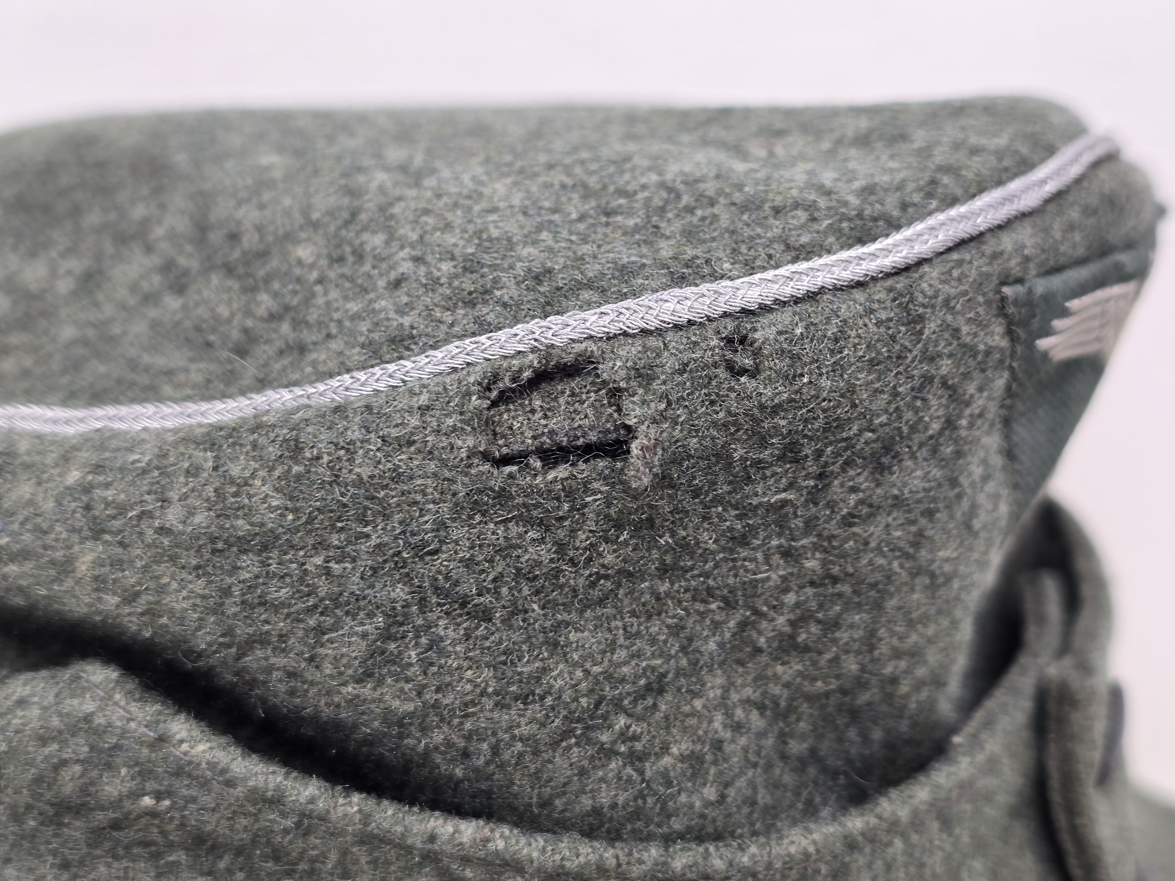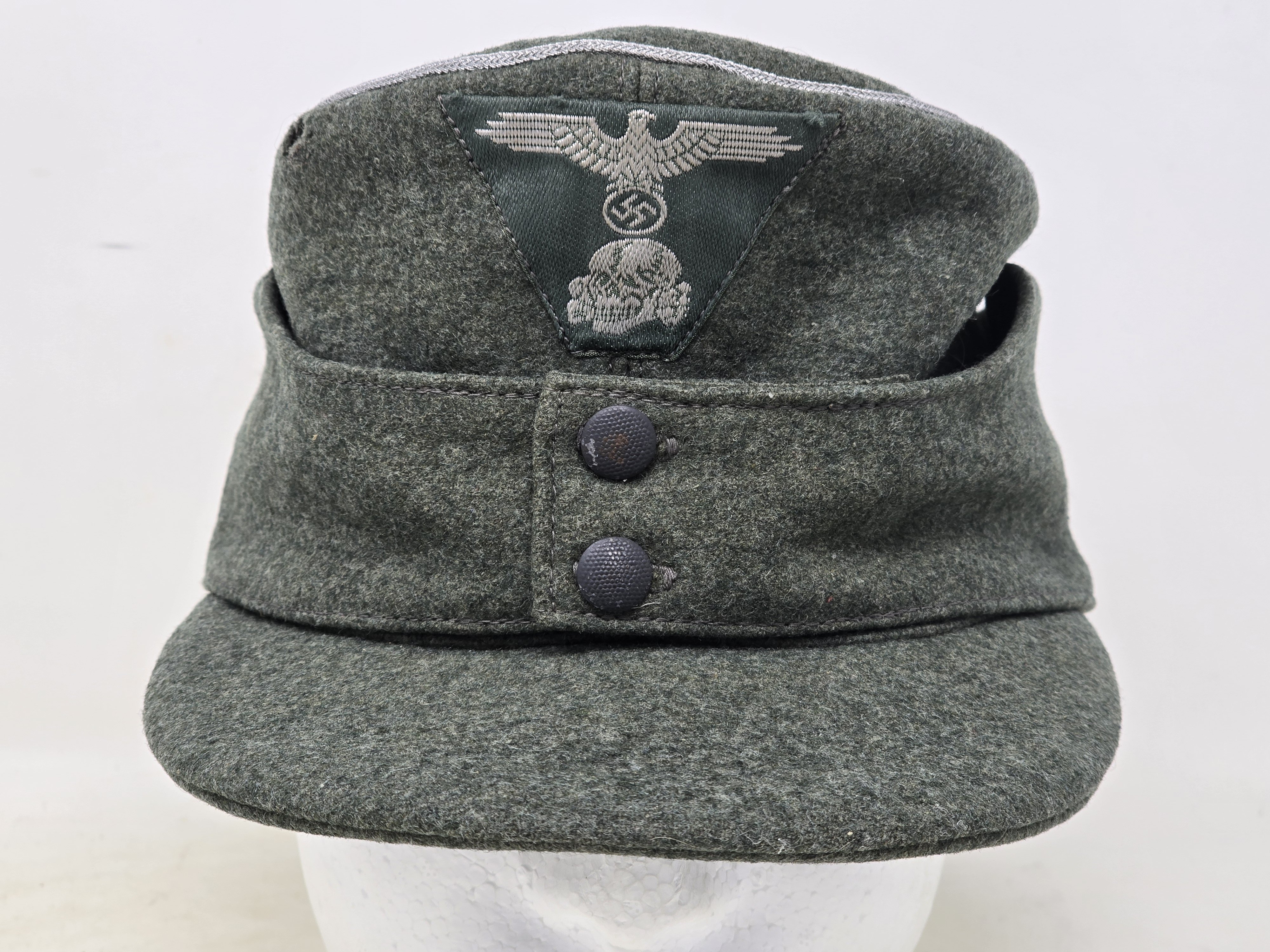 This is a mint quality SS Officer's M43 cap with trapezoid and aluminum piping at the trim. The insignia is bevo, and it is sewn using the 'flip and zip' method, commonly seen in the factory products. The cap is in standard quality feldgrau wool, has a full herringbone lining, mint and size marked. The cap overall is mint and has a storage chew to the upper right area. Overall, a fine cap. COA accompanies.