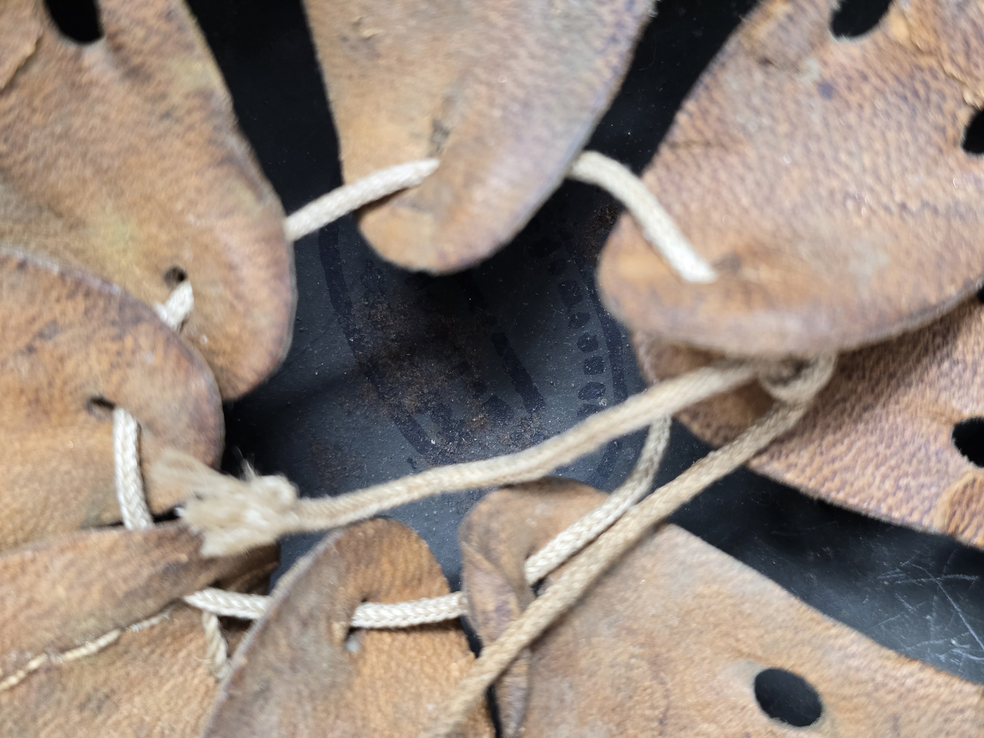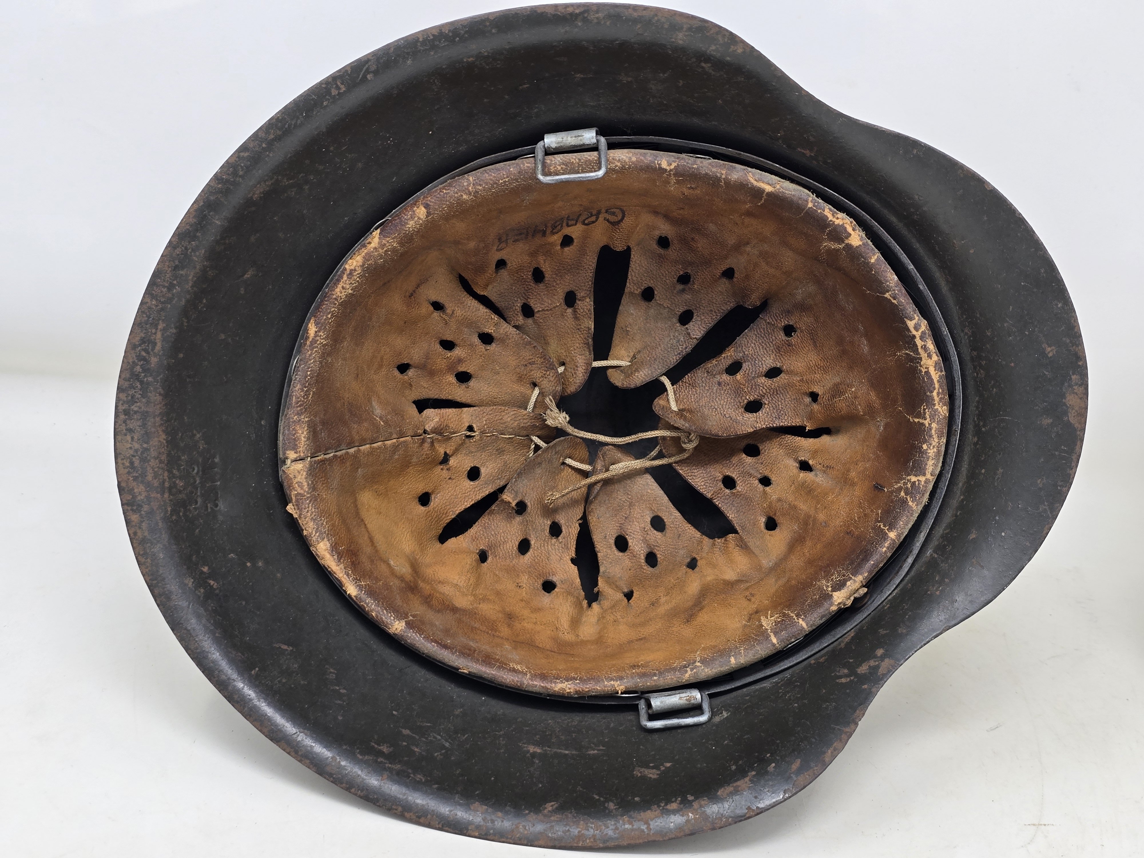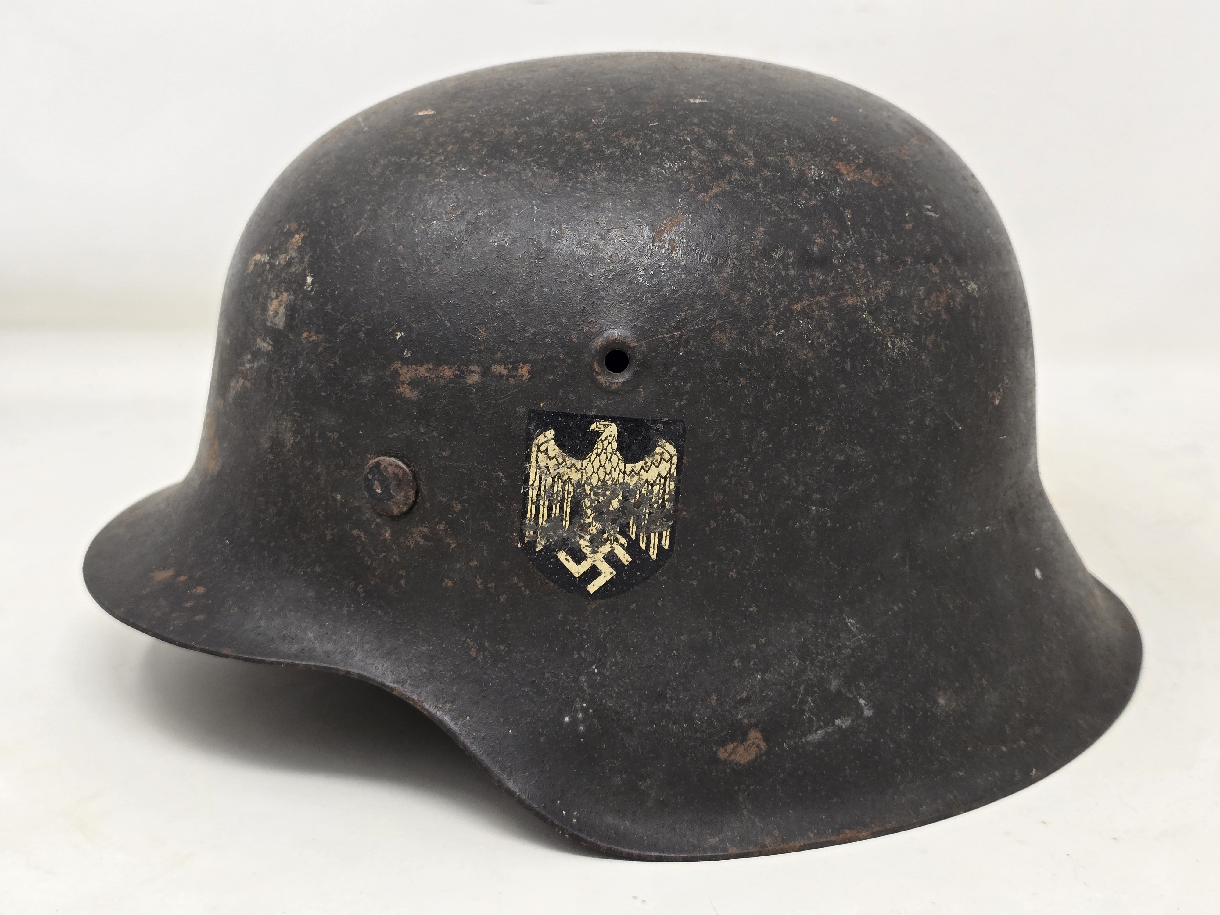 This M42 Heer helmet, ckl62, #2839, came from a Midwest collection of four decades. It is untouched condition, with mild evidence of having been stored stacked, or in a pile of helmets at one time. The ET schiefergrau finish is fine, with a light sprinkle of patina. The Heer adler shows a scuff. The dome stamp is crisp and completely visible. The liner is light golden brown, with two names. Chinstrap is missing. Overall a great example. COA accompanies.