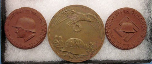 Original period manufacture. Lot of 11 pieces of Stahlhelm related table medals, metal insignia, stickpins etc. Condition as shown.