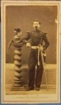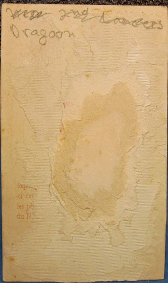 Original period manufacture. Clear full length image of a French Dragoon of the 2nd Empire. He rests his arm on the top of a photographers prop next to his helmet, while holding his saber in his left hand. Lowendal photographers name at the bottom, reverse has glue residue from being mounted in a display.