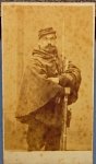 Original period manufacture. French Franco-Prussian War cdv, Garde Nationale Soldier, Armed with Tabatierre rifle & bayonet, Wearing a kepi and hooded clock, very determined gaze. Beaune photographers logo.