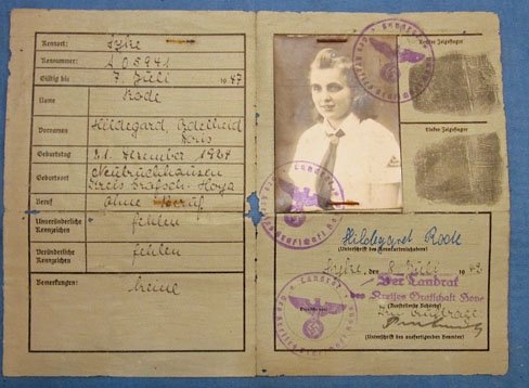 Original period manufacture. BDM oil cloth identity card, young women born in 1924, issued in 1942. clear photo of her in uniform. Wear to the spine.