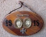 Original period manufacture. Purchased about 20 years ago in Germany. Oval shaped wall hanging measuring 4.25 inches in width. The wood looks to be that used in an early aircraft or airship propeller. At center are two brass framed photo ovals, wife on the left, husband on the right, with the man wearing a sailors service cap with visible cap tally. What I can clearly make out is the abbreviated word Abtl. followed by what appears to be a word beginning with the letters FL, the word to the left is pretty much a blur to my eyes. Above the picture frames is a tiny brass aircraft propeller, below a 1914 Crown W Iron Cross, with a hand painted year date of 1918. Around the frame is a braided cord in red and black, the colors of the Kingdom of Wurttemberg.