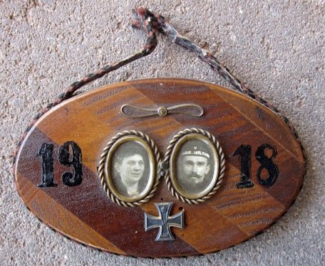 Original period manufacture. Purchased about 20 years ago in Germany. Oval shaped wall hanging measuring 4.25 inches in width. The wood looks to be that used in an early aircraft or airship propeller. At center are two brass framed photo ovals, wife on the left, husband on the right, with the man wearing a sailors service cap with visible cap tally. What I can clearly make out is the abbreviated word Abtl. followed by what appears to be a word beginning with the letters FL, the word to the left is pretty much a blur to my eyes. Above the picture frames is a tiny brass propeller, below a 1914 Crown W Iron Cross, with a hand painted year date of 1918. Around the frame is a braided cord in red and black, the colors of the Kingdom of Wurttemberg.