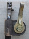 Original period manufacture. Satin blue finish to the blade and socket, the locking ring moves easily. Dent free blue steel scabbard with nearly 100% original finish remaining. Large brass hook mounted to the leather frog, to allow the scabbard to slip over the woven cartridge belt, the narrow tab slipping into one of the empty cartridge loops. RIA stamped into the reverse of the belt hook, leather tab is loose on the scabbard body, typical age related situation with these.