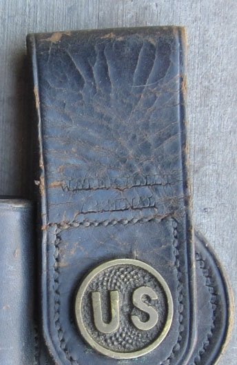 Original period manufacture. Satin blue finish to the blade and socket, light speckling of surface corrosion, the locking ring moves easily. Standard leather frog with brass US disc, Watervliet Arsenal markings, black paint finish on the dent free steel scabbard body.