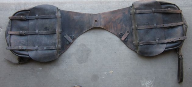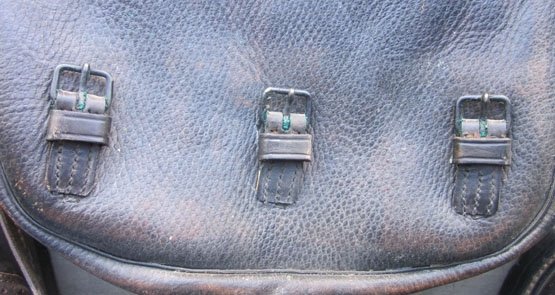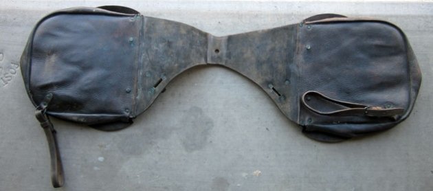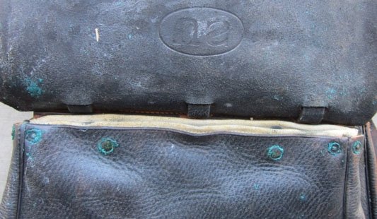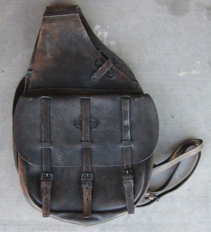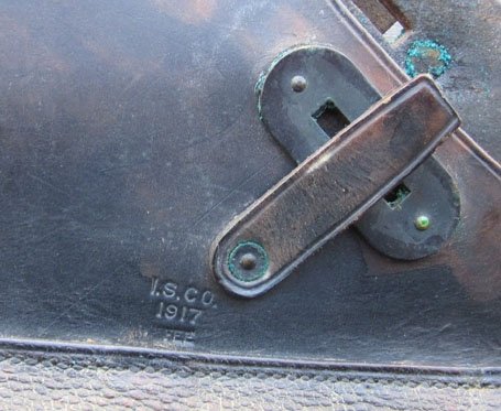 Original period manufacture. Re-dyed, now black leather bags in lightly used condition. All of the flap securing straps remain intact, with buckles present. Both of the white canvas bag inserts are present. Maker marked and dated on the connecting yoke, I.S.CO 1917 with inspectors initials of T.E.E.. The leather remains very pliable