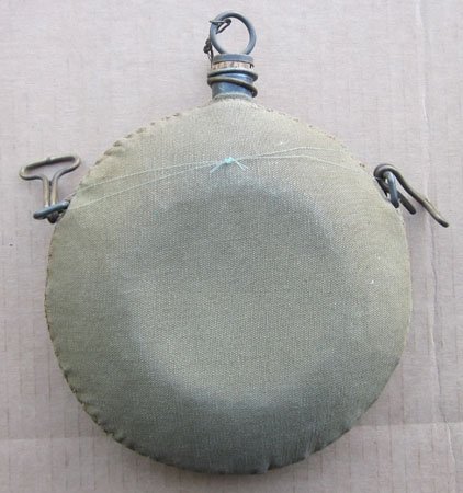 Original period manufacture. Indian War era pattern canteen with a near new condition RIA 1916 stenciled canvas cover. No sling, but the brass attaching hooks are present. No holes or tears in the cover, front pushed in a bit during storage.