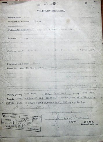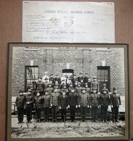 Original period manufacture. Copy military record documents dated 1931, detailing the service of Virginia native, Leo Thomas Cumming, his character noted as excellent. Expert Rifleman badge 1919, Dominican Republic June-October 1918. Black & white 8x10 group photo of Marines and sailors, Cumming is not identified.