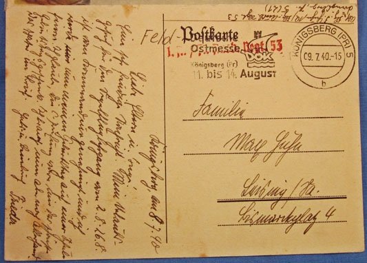 German WWII Postcard, DLV, Feldpost Cancellation, Konigsberg 1940