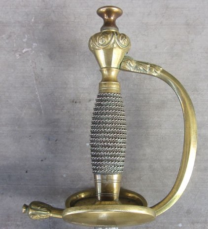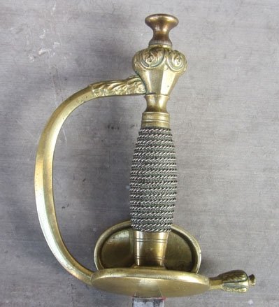 Original period manufacture. Polished steel blade measuring 31 inches in length, with an etched design on both sides of the blade and spine. Fine quality brass guard, one side folds up for wear. Two types of twisted wire used to form the grip covering, very nice quality. Black leather bodied scabbard, which amazingly is not broken, brass throat and chape. A sword pattern used prior to 1889, including the Franco-Prussian War.