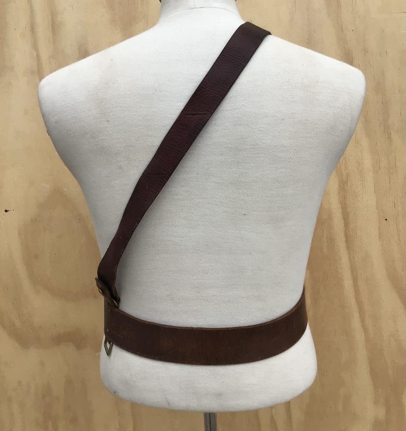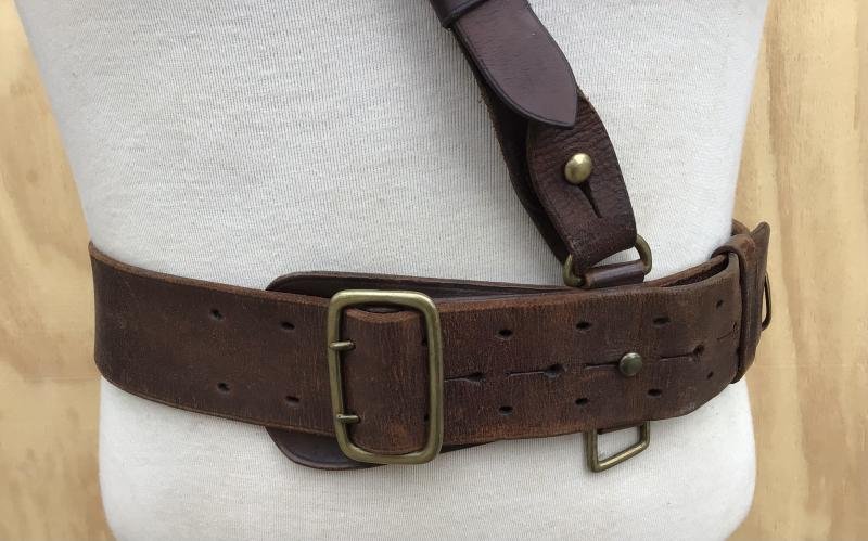 Dark brown leather with single cross strap. Not dated. Cross strap and belt have some different hand written initial on the undersides. Belt extends to approx 1050mm. The tab is stamped 'Large'.