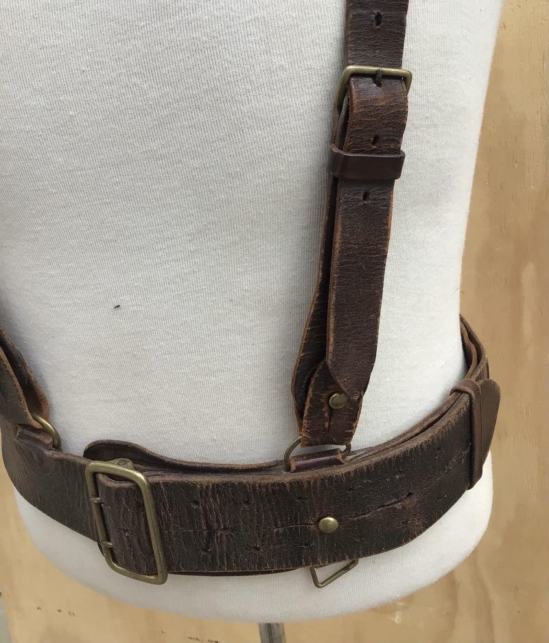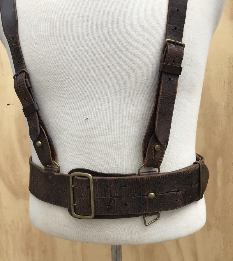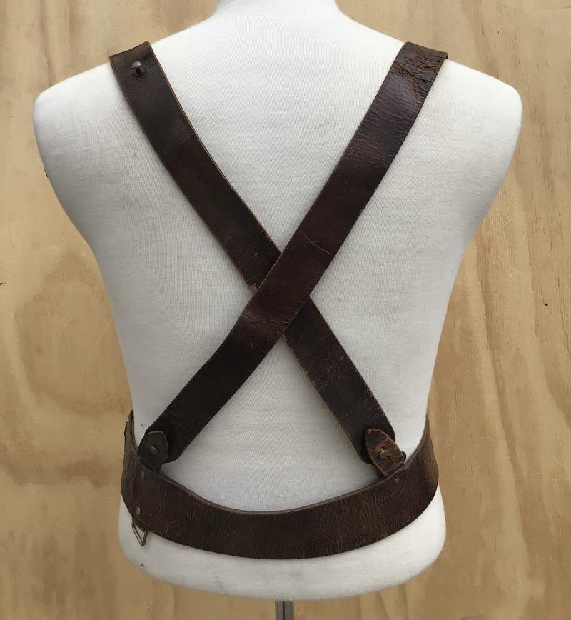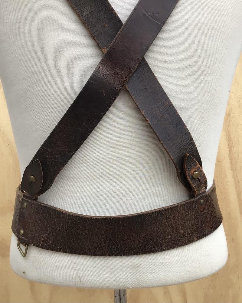 Brown leather with double matching cross straps. The leather nice and supple. The buckle tab clearly marked with 'D' arrow 'D 'CMF' 'SA' (South Australian Militia) and dated 1912. Belt extends to approx 1100mm.