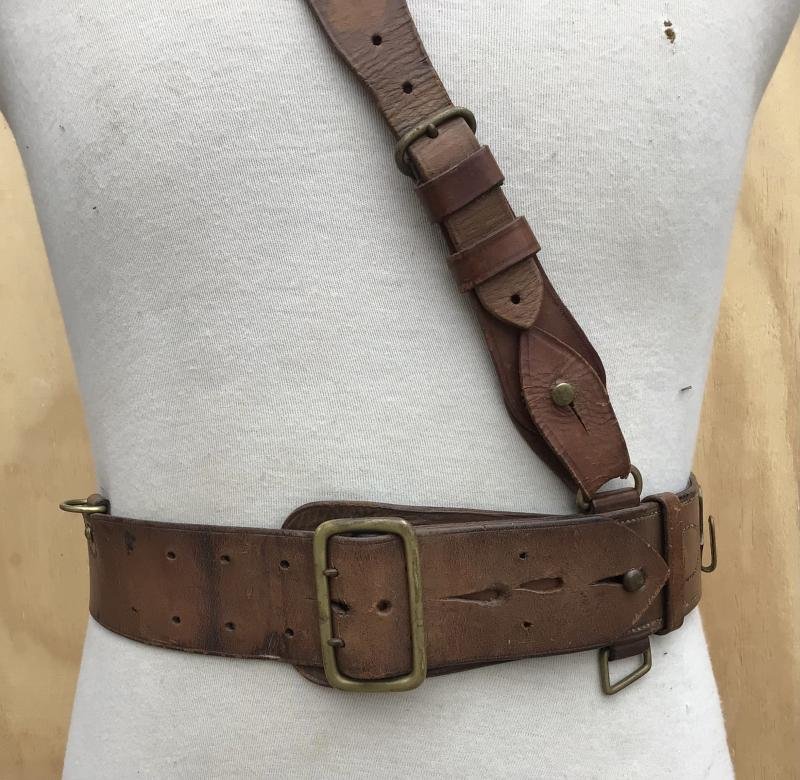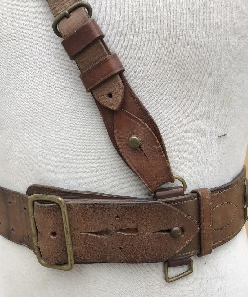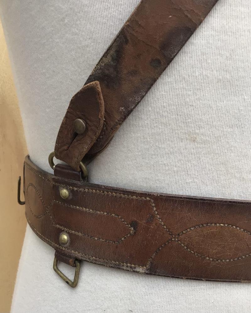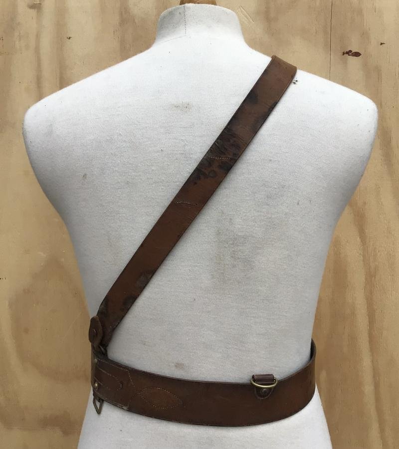 A good example with single cross strap. The buckle tab maker marked and dated 1917. Some age / storage stain. The brown leather still supple and usable for a tunic display. The belt extends to a max 930mm.