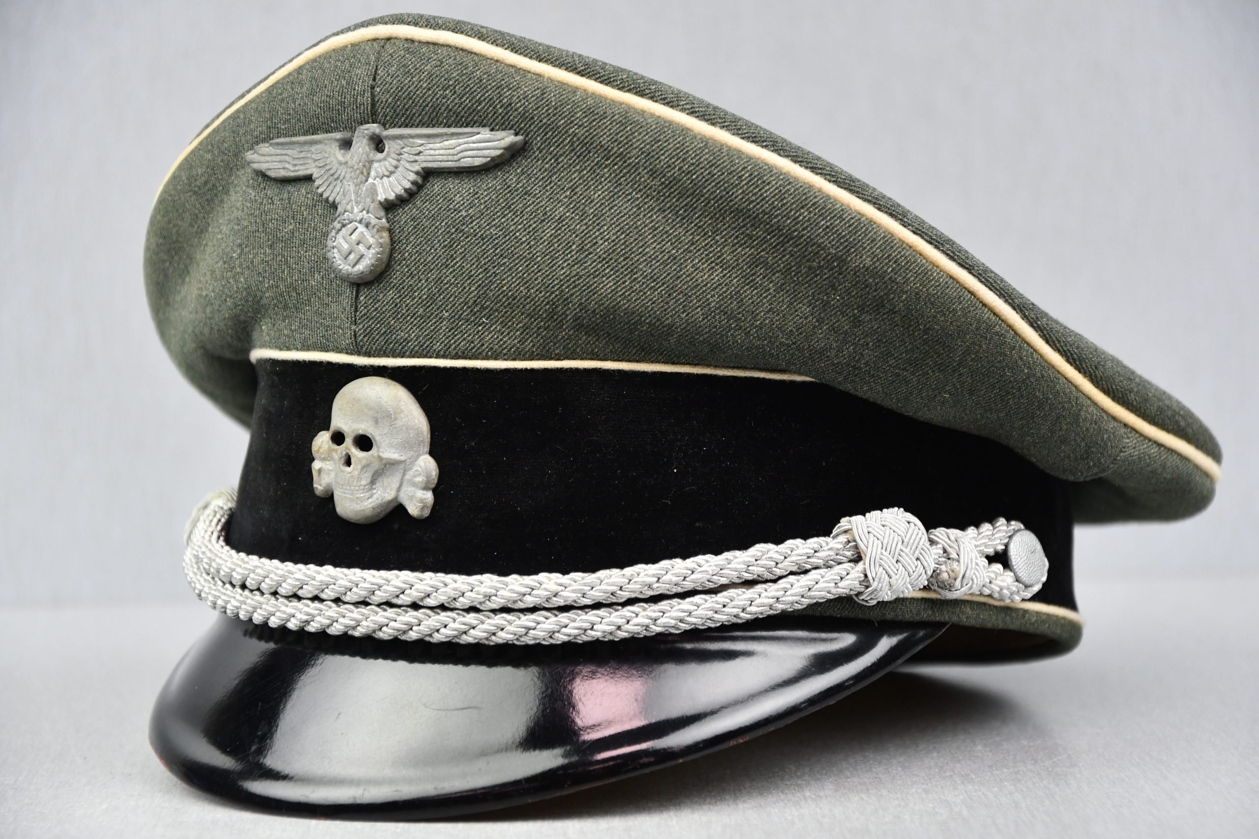 Genuine and original 'Kleiderklasse' Waffen-SS officer visor cap. Minimal worn officer visor cap in excellent condition, having a very appealing look and shape. The black velvet band in the middle still has a shiny look. The cap is complete with an original desirable SS skull, in my opinion made by Overhoff and a zinc cap eagle by Assmann. The cap still holds its genuine saddle shape. Inside shows no markings, as should be with SS Kleiderklasse visors. Size +-57. Named inside to SS-Sturmbannführer W. Dumrauf. A very unique chance to obtain a unquestionable original Waffen-SS officer visor cap!Kleiderklasse:Waffen-SS officers bought their uniforms from an allowance they were paid, either from a tailor or through the Kleiderklasse system where the officer paid a monthly amount and could draw supplies from a series of Kleiderklasse outlets. They would have had several tunics, a tailor-made one for best and probably a lesser quality or even an issue one for in the field.