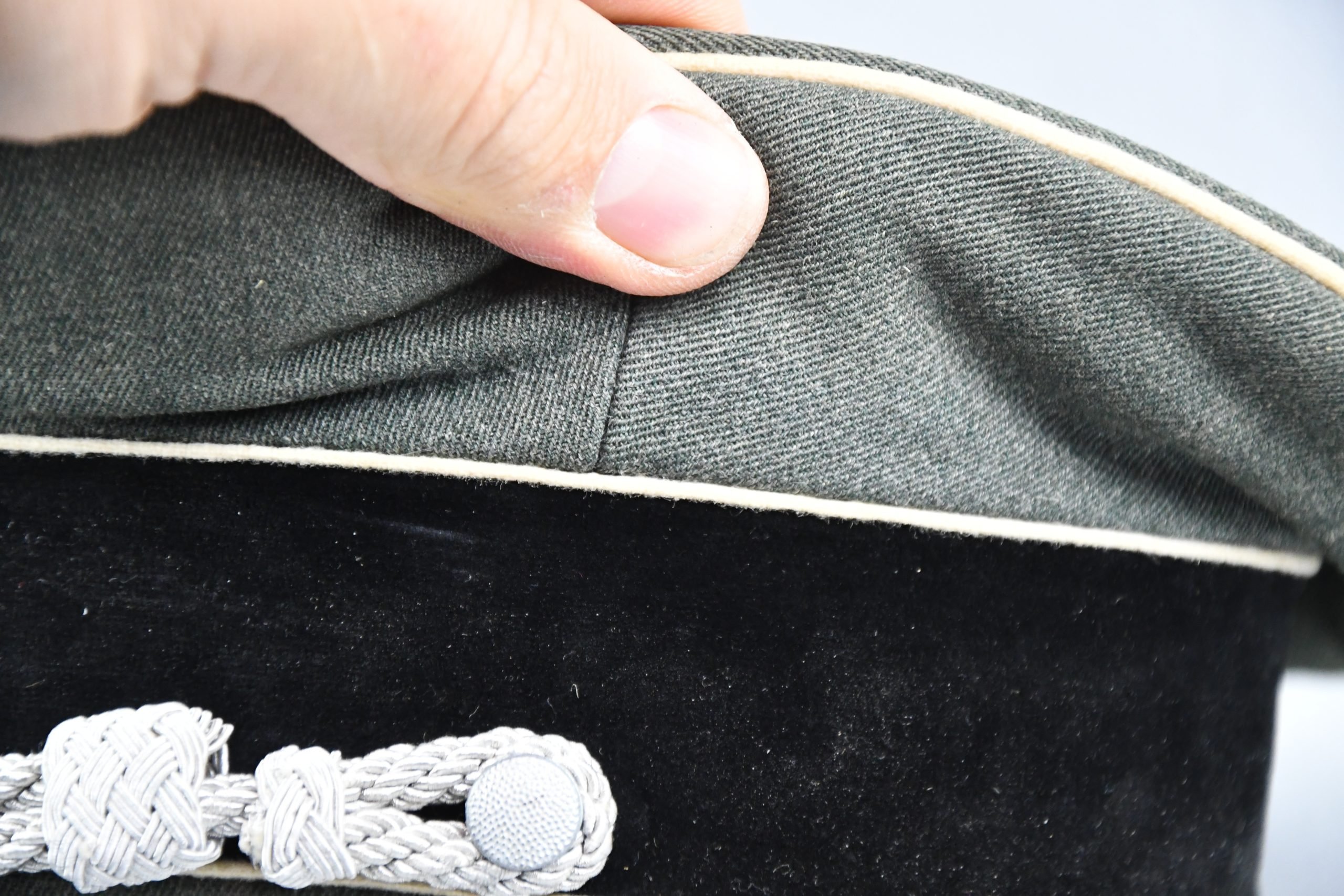 Genuine and original 'Kleiderklasse' Waffen-SS officer visor cap. Minimal worn officer visor cap in excellent condition, having a very appealing look and shape. The black velvet band in the middle still has a shiny look. The cap is complete with an original desirable SS skull, in my opinion made by Overhoff and a zinc cap eagle by Assmann. The cap still holds its genuine saddle shape. Inside shows no markings, as should be with SS Kleiderklasse visors. Size +-57. Named inside to SS-Sturmbannfรผhrer W. Dumrauf. A very unique chance to obtain a unquestionable original Waffen-SS officer visor cap!Kleiderklasse:Waffen-SS officers bought their uniforms from an allowance they were paid, either from a tailor or through the Kleiderklasse system where the officer paid a monthly amount and could draw supplies from a series of Kleiderklasse outlets. They would have had several tunics, a tailor-made one for best and probably a lesser quality or even an issue one for in the field.