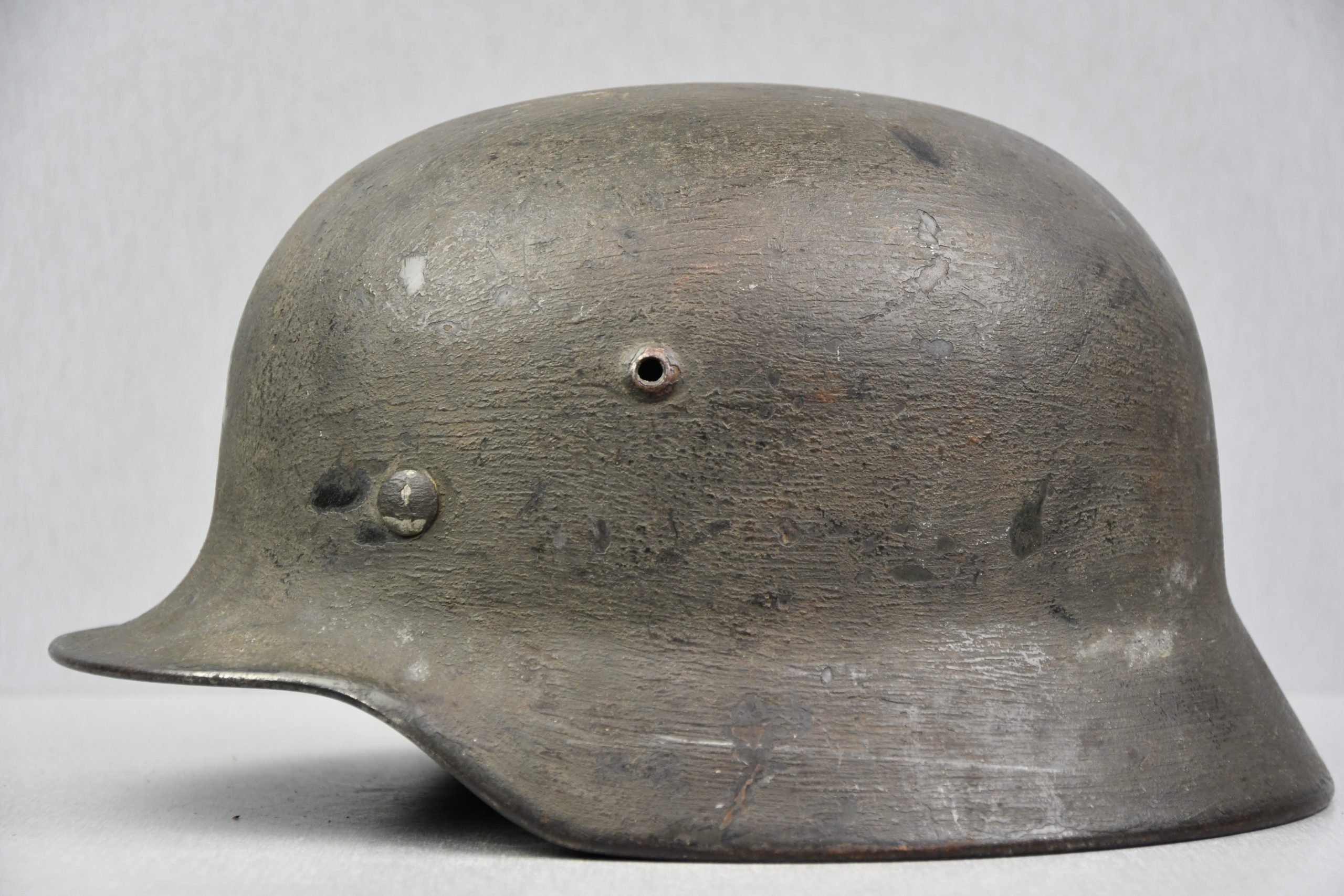 Stunning and well preserved M35 pattern steel helmet by the frim Quist. The helmet was camouflaged in field green color covering both decals on each side using a thick brush. Complete with original liner. The leather is still supple and strong and shows a 57 size mark. The genuine draw string is still present. The split pins are straight. Original captured foreign chin strap present, something I've observed in the past. The best thing of course is the name in the rear, which is an officer with rank Oberleutnant (Oblt.) named Stein. Maker marked shell by Q, size 64. Lot number: 1356.
